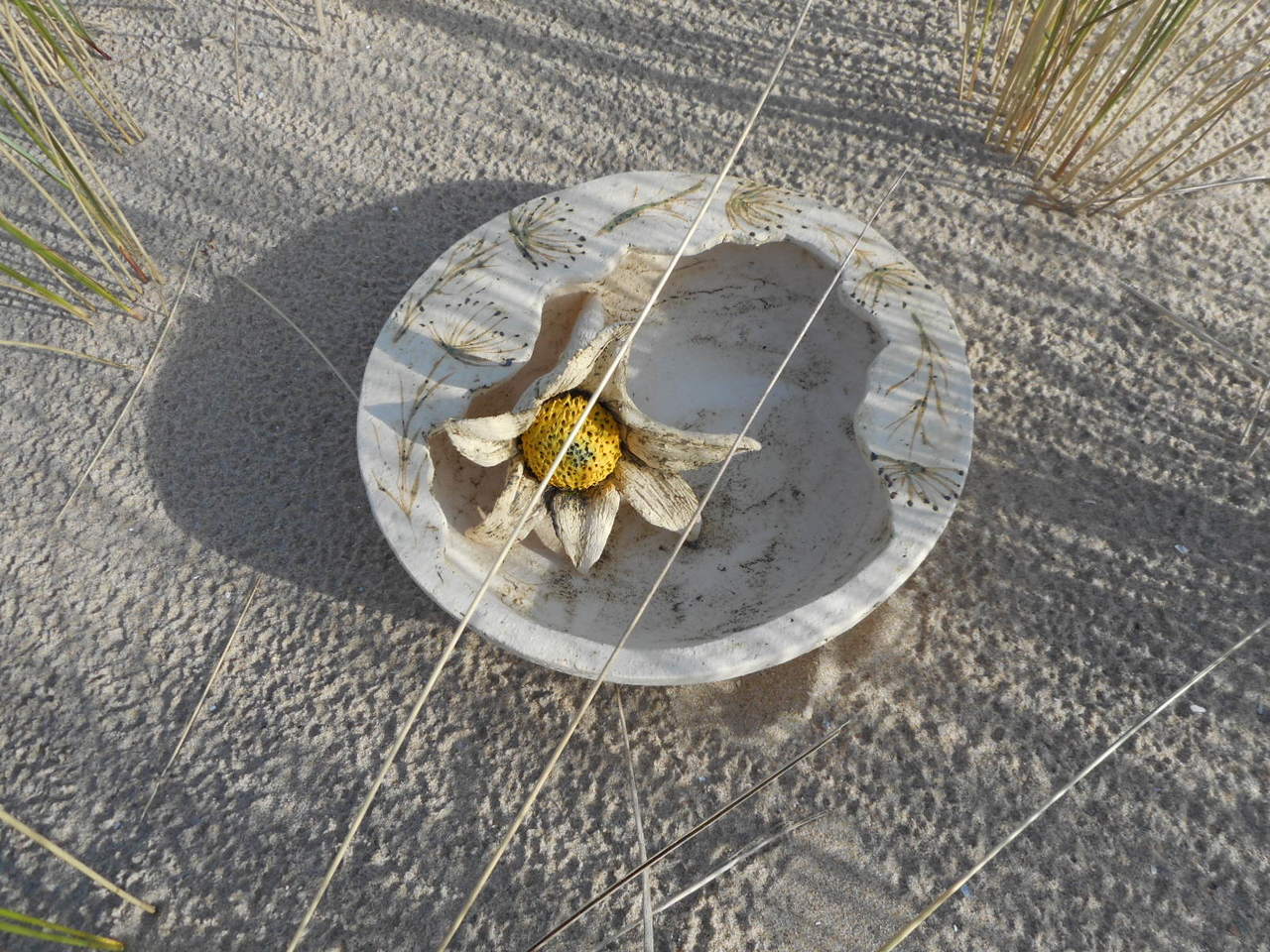 Schaal met bloem, handvorm. Bewerkt met oxyden en glazuur.