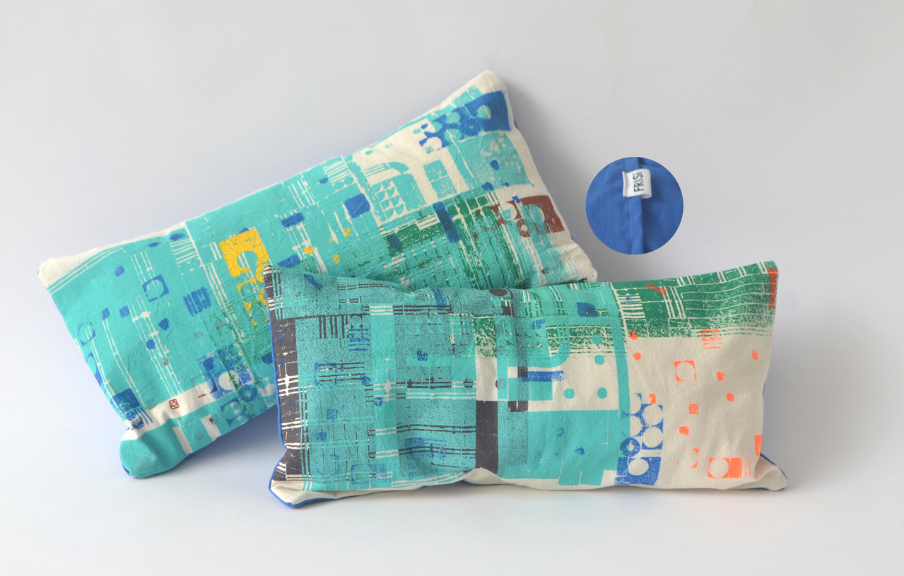 Lego druk. Achterkant van het kussen is effen blauw met envelop sluiting. Kussen hoes kan gewassen worden op 30 graden.