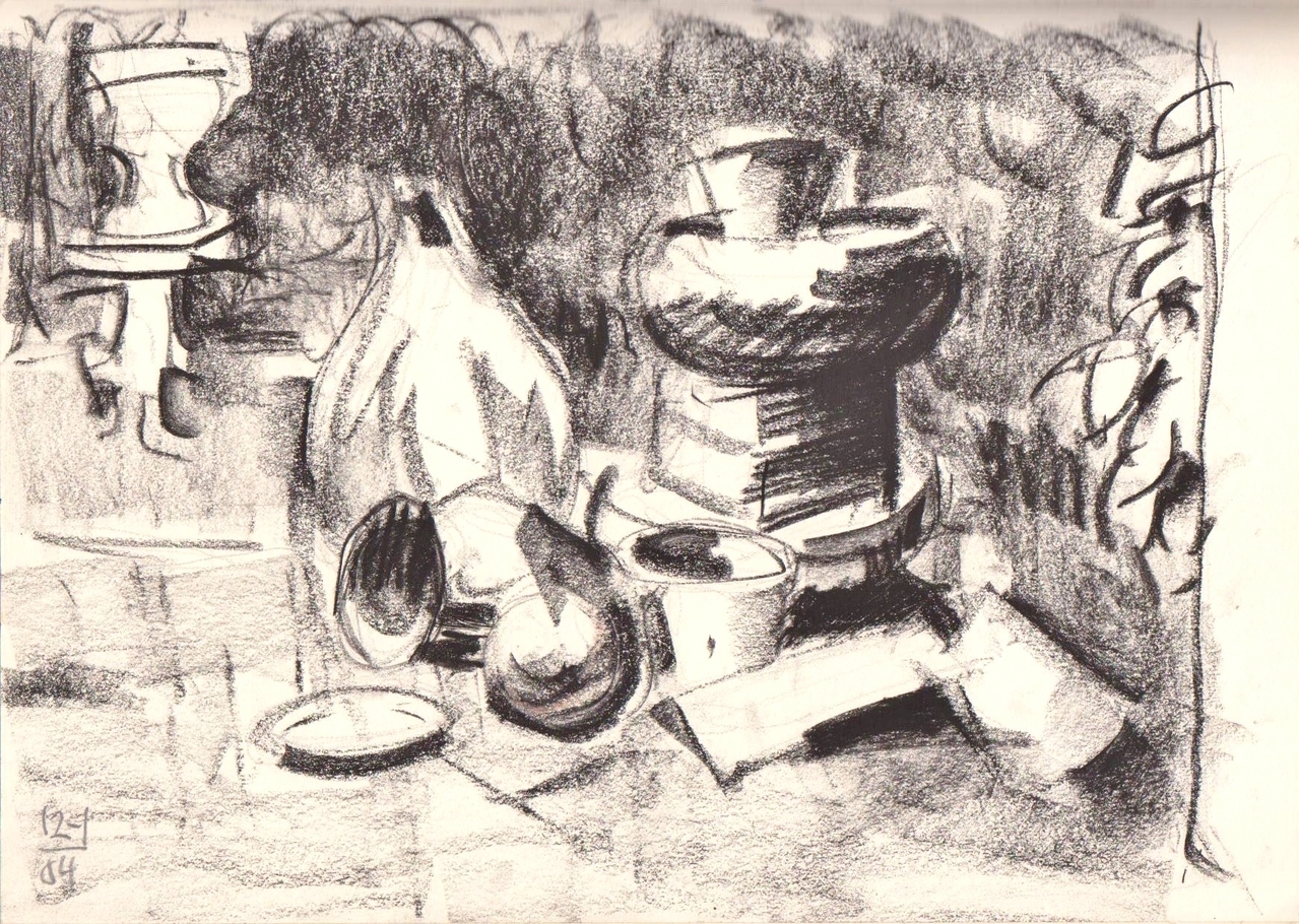 Met houtskool en een schetsboek de tuin in gegaan, in het vroege voorjaar: er zijn nog geen bloemen geplant in de potten