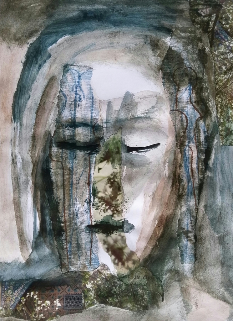 Door een combinatie van tekeningen van mezelf en stukjes tijdschrift en hierover een portret te schilderen , is een boeiend beeld ontstaan vol emotie.