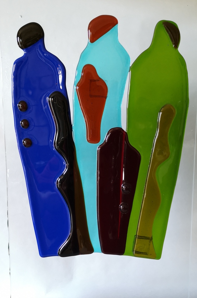 Groep gekleurde figuren samen gefused. Bevestigd op achterplaat van blank glas. Staand object of als wanddecoratie.