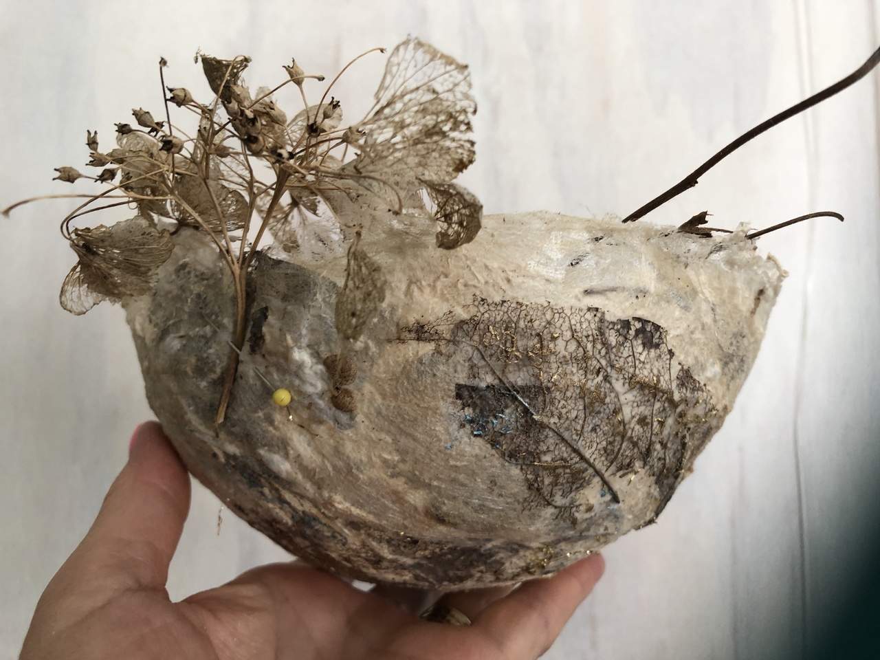 kom van zijde vlies met bladskeletten en natuurlijke materialen
