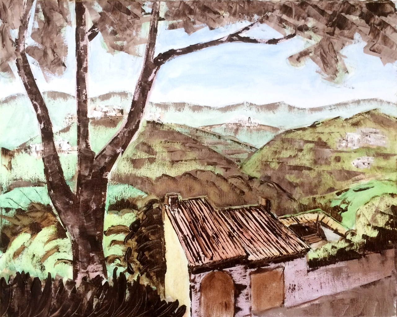 Een stadje aan de Côte d'Azur, geschilderd met paletmes 4 jaar later n.a.v. een vakantiefoto uit 2014