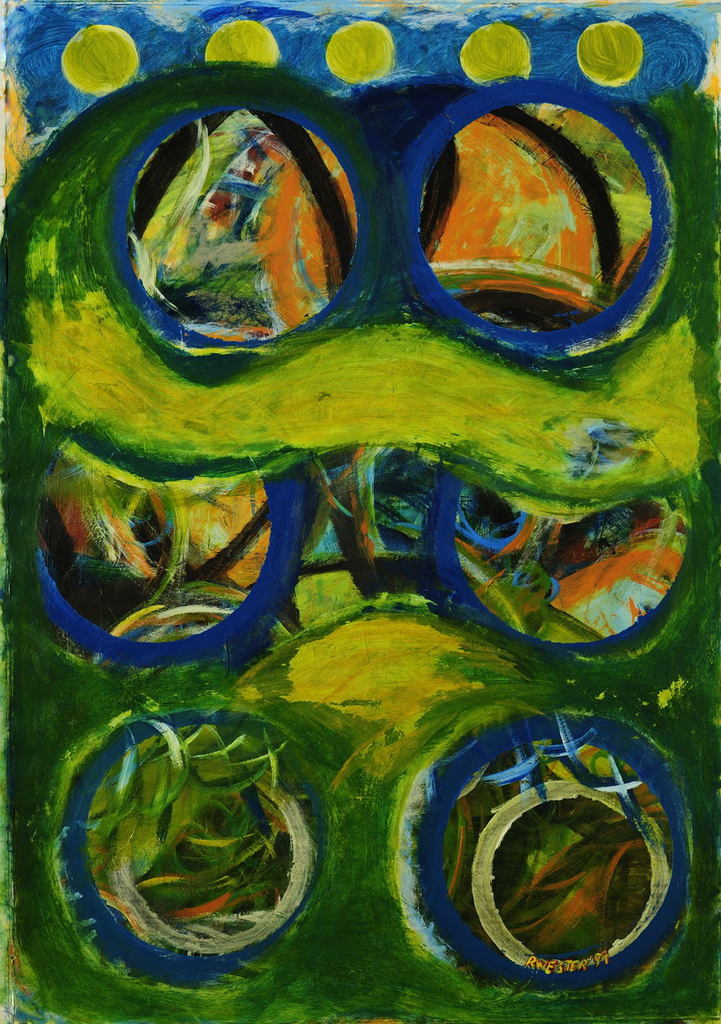 mijn schilderijen zijn gesitueerd in de stedelijke agglomeratie,met Nederland als achterliggende kracht.de overdaad aan mogelijkheden,vergezichten,architectuur en sferen probeer ik samen te vatten.deze stedelijke explosie breng ik in kaart door middel van abstracte landschappen,die ik een mystieke gelaagdheid geef als ware dat alles wat zich hier manifesteert op aarde een blauwdruk is van boven.