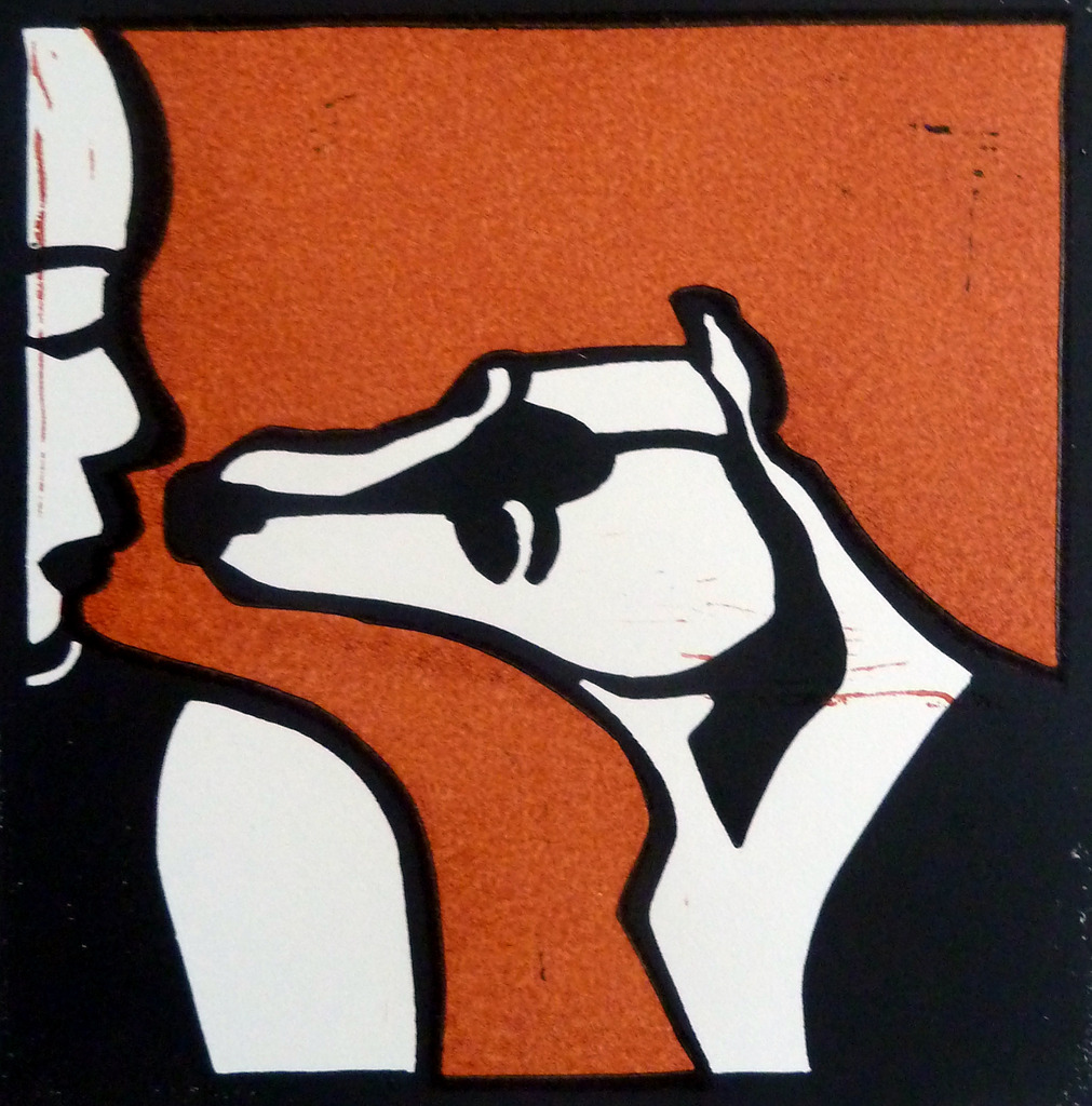 Linoleumsnede twee kleuren vrouw met windhond