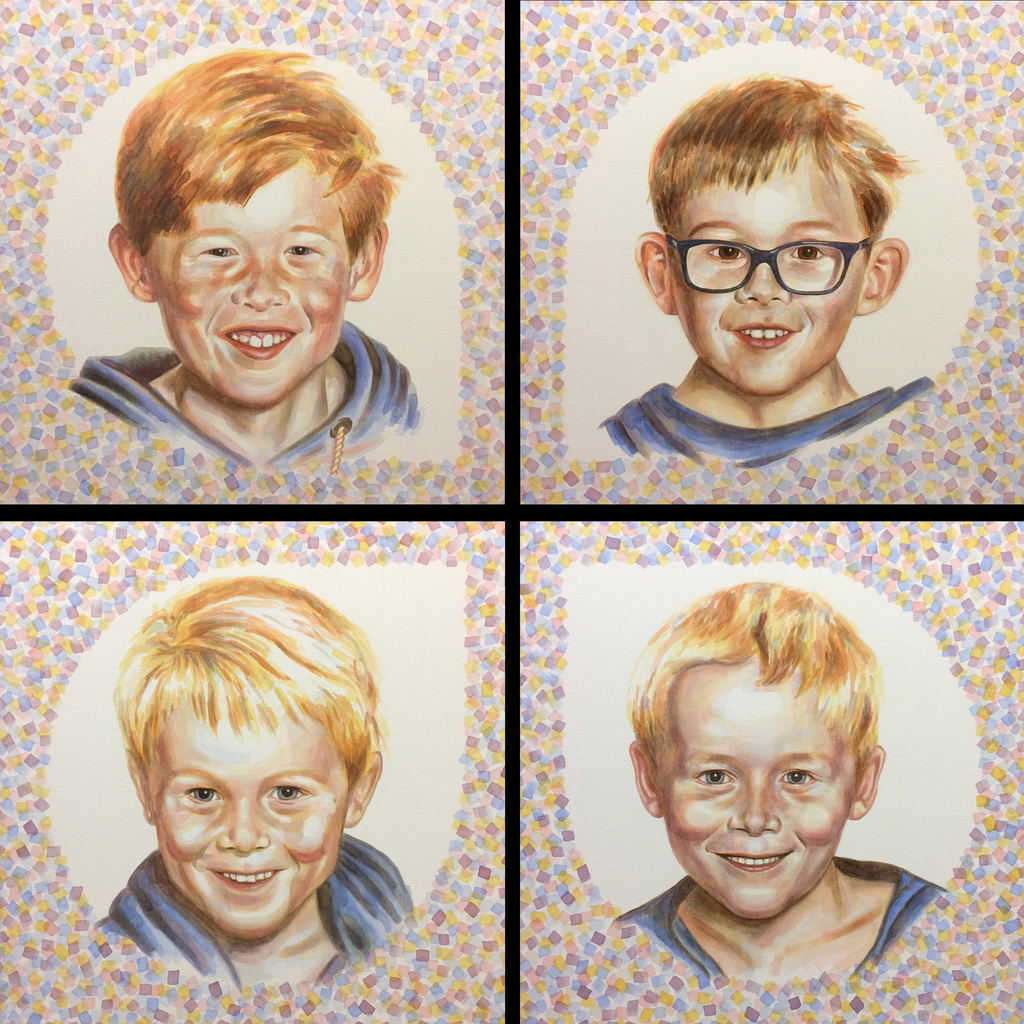 In het diepste geheim werken aan een prachtig cadeau voor een moeder van vier zonen ter gelegenheid van haar veertigste verjaardag. Hoe leuk en spannend is dat! Ruim een maand voor de verjaardag kwam de vader/opdrachtgever bij me met twee foto’s van de vier jongens. Of ik een aquarel op groot doek kon maken van zijn jongens. O ja, en we hebben ook wat met een klavertje vier, je snapt wel waarom... In overleg met de opdrachtgever besloten we tot vier losse 3D doeken van elk 60x60cm, gevat in een speciale lijst van plm. 128x128cm.