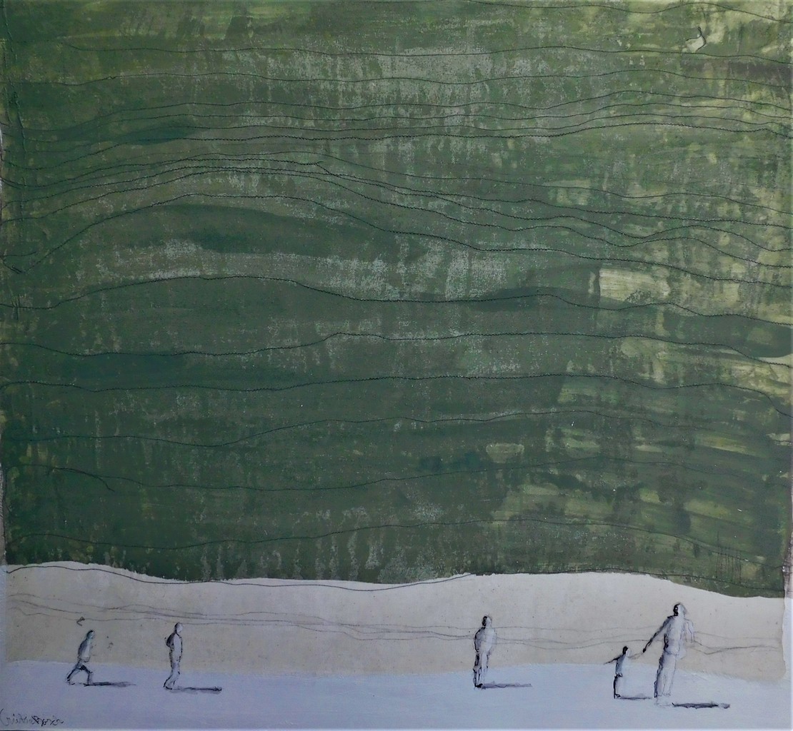 landschappen. Poëtisch maar ook vervreemdend. Met humor en onverwachte wendingen. De kern van de compositie wordt gevormd door grote vormen met een krachtige uitstraling , toegevoegd worden kleine details waardoor je al lopend door het schilderlandschap stuit op onverwachte ontdekkingen.