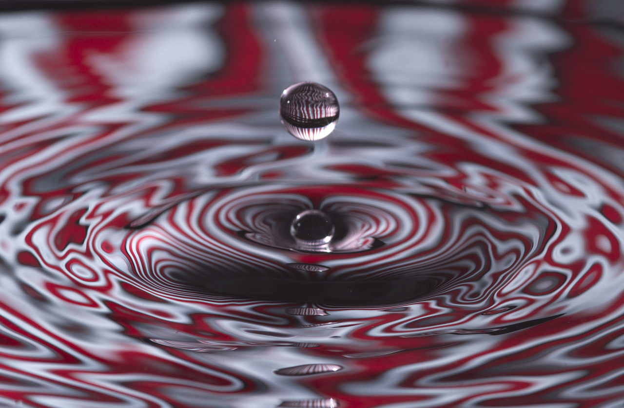 In de serie The Art of Water heb ik waterdruppels tegen een gekleurde achtergrond gefotografeerd met indirect flitslicht. Deze is afgedrukt op acrylglas