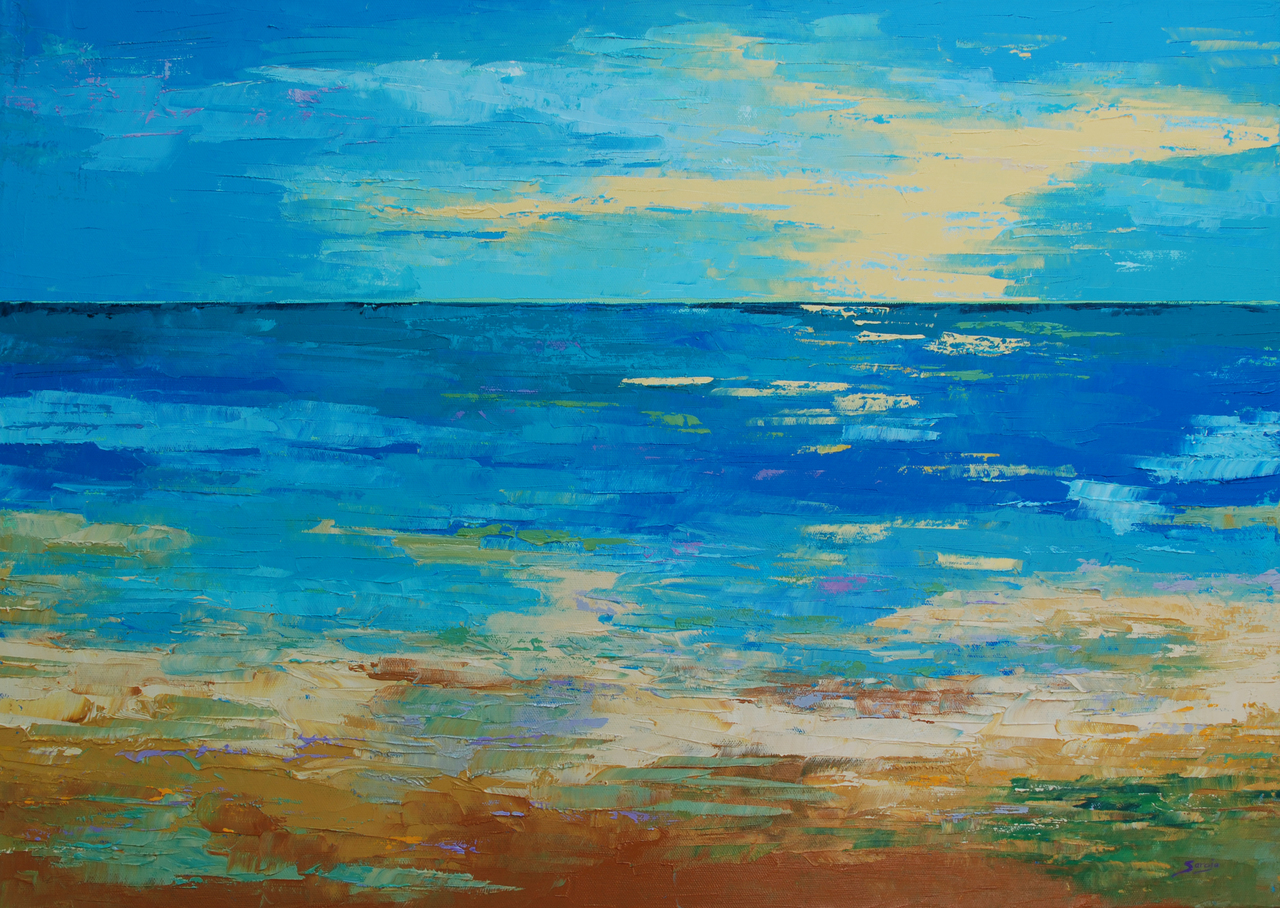 Unieke, abstracte en impressionistische landschapsschilderijen van de kust van de Atlantische oceaan bij de Costa Vicentina, Alentejo, Portugal, geschilderd met olieverf en paletmes door Saroja. Deze serie schilderijen zijn ingelijst.