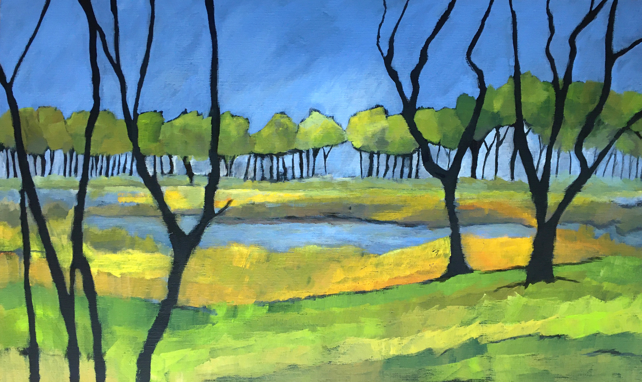Schilderij Geel Landschap Blauw Groen Geabstraheerd