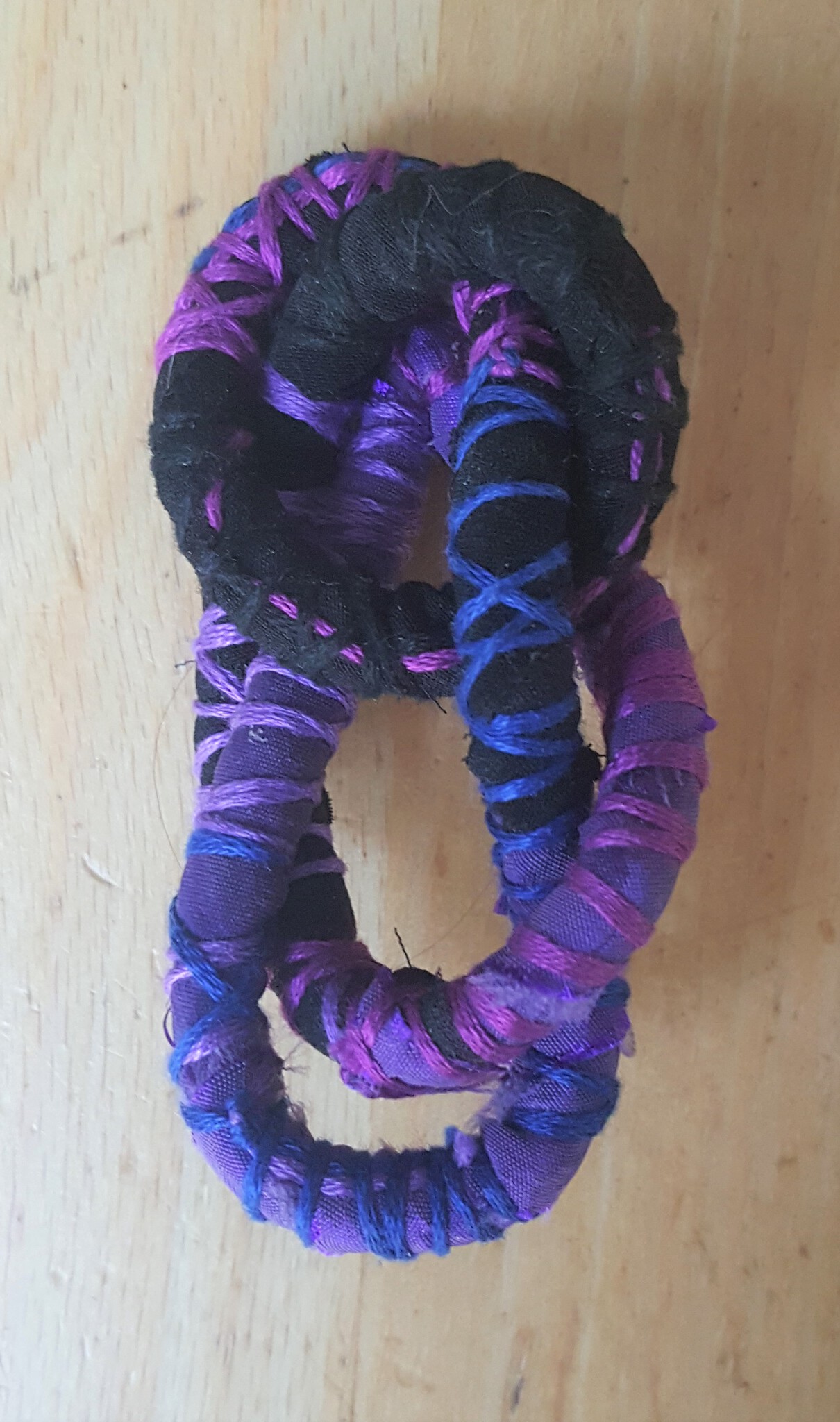 Oude stukjes textiel met borduurgaren. Sluiting is een lila speldje