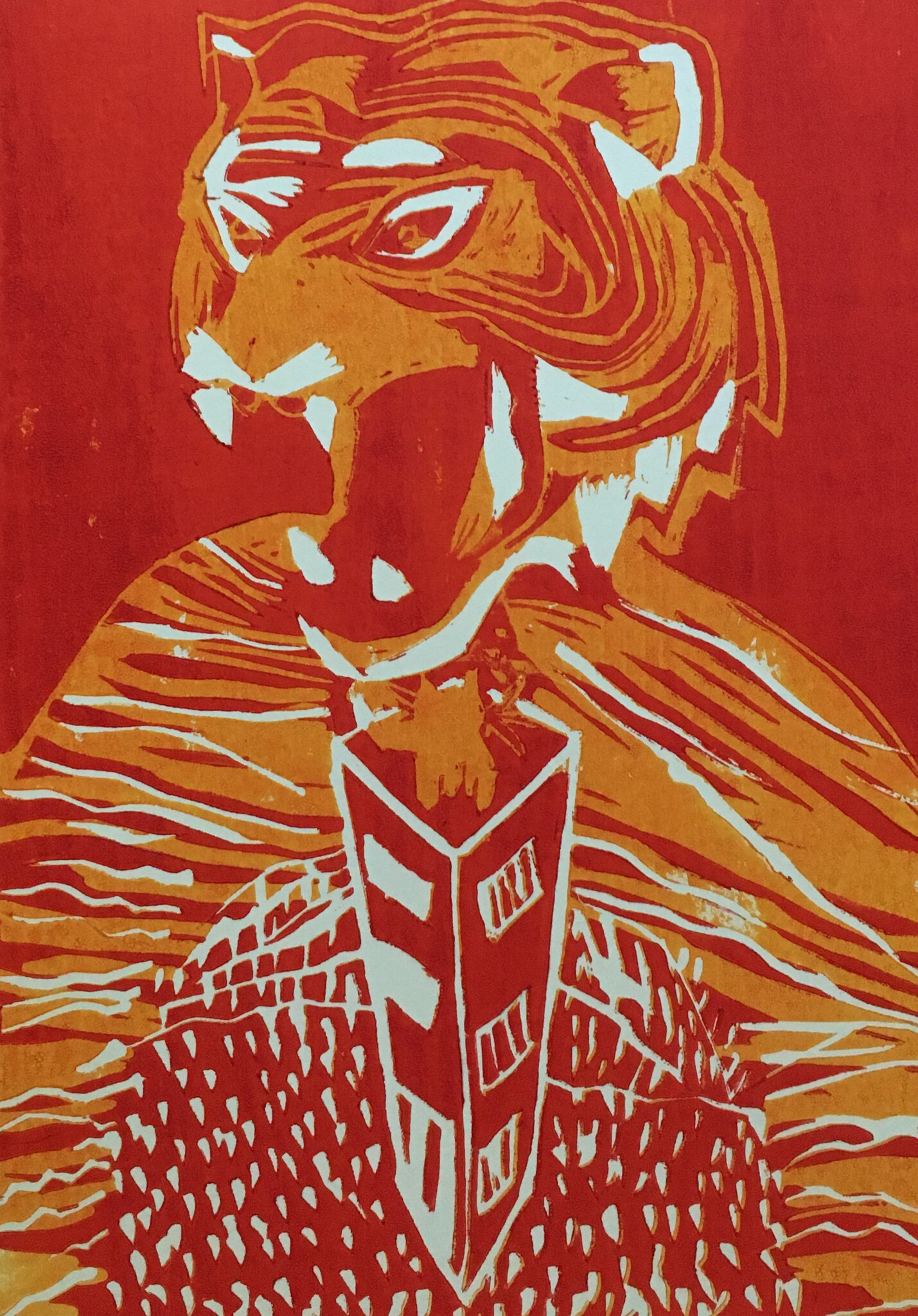 Lino druk. Een kat met zelfvertrouwen.