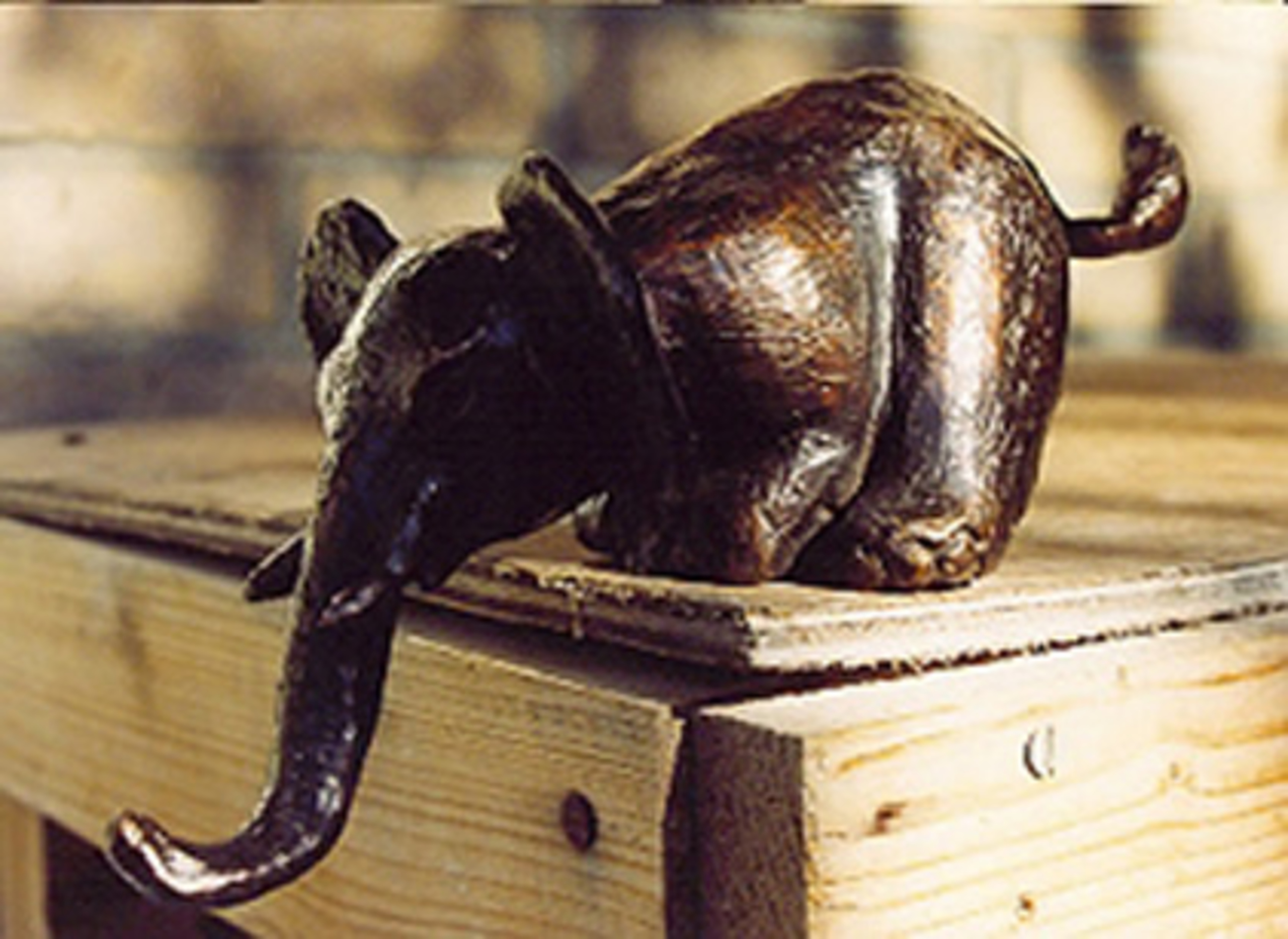 Geknield Olifantje/Kneeling Elephant Materiaal/Material : Brons, Bronze Gewicht: 2,5 kg Gemaakt in/made in: Apeldoorn, 2003 Oplage/Edition: max. 12 exemplaren, nog 4 ex. te koop. Opmerking: Eerder heb ik andere olifantjes gemaakt. Dit beeldje is ontstaan naar aanleiding van een bezoek aan de dierentuin in Berlijn, waar ik een vissende olifant bezig zag iets te proberen uit de gracht te hengelen. Het zag er heel grappig uit. Dit is het 7e exemplaar uit een serie gegoten van max. 12.