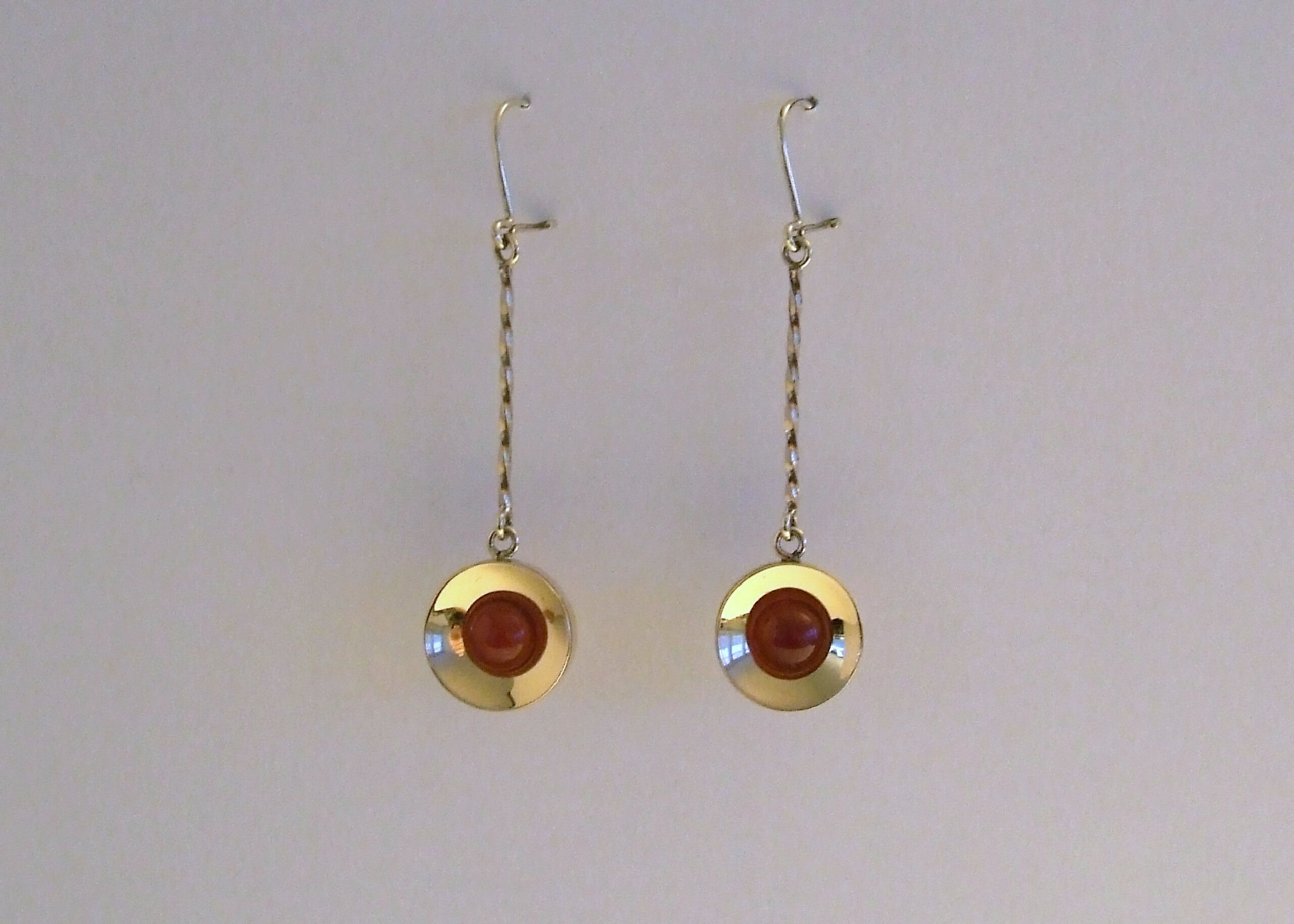 Cirkelvormige oorhangers 14 mm rond. De voorzijde bestaat uit een holle kom, waarin een ronde carneool van ca. 7 mm is aangebracht. Deze is opgesloten door middel van een deksel met bajonetsluiting. Het sieraad is opgehangen aan een getordeerd staafje en wordt gedragen met oorhaak. (ontwerpopdracht S1081)
