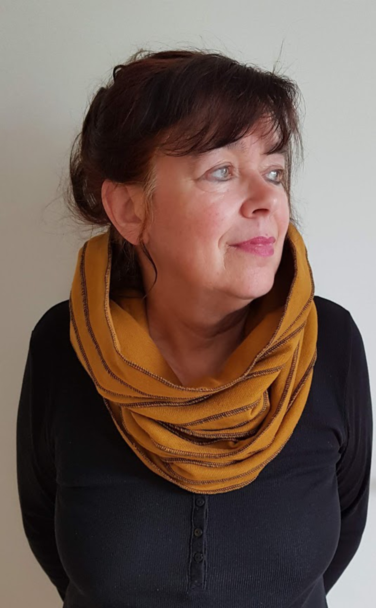 Gevoerde col, katoenen joggingstof, kerriekleur, afgewerkt met zwarte locksteek