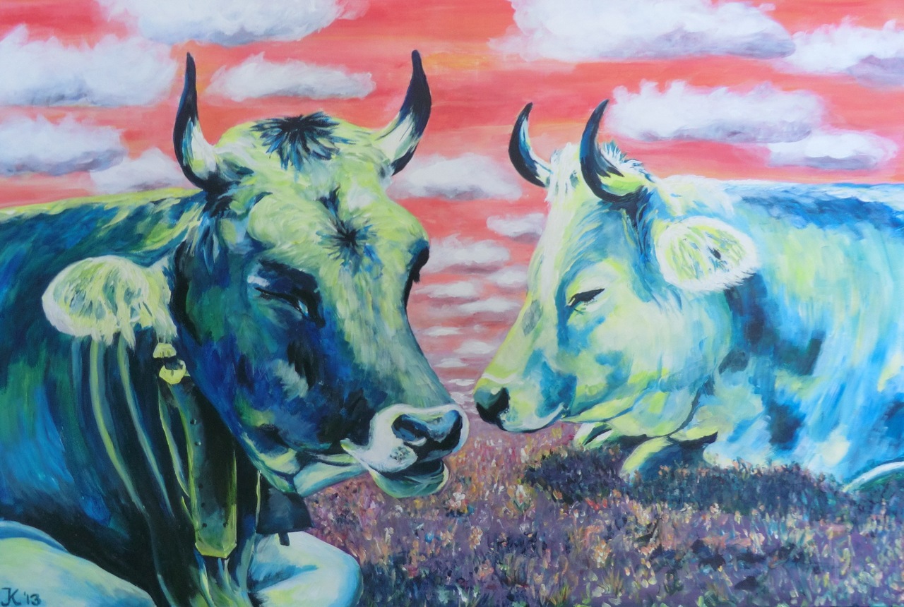 Twee herkouwende koeien, door de kleurkeuze is de sfeer surreeel.