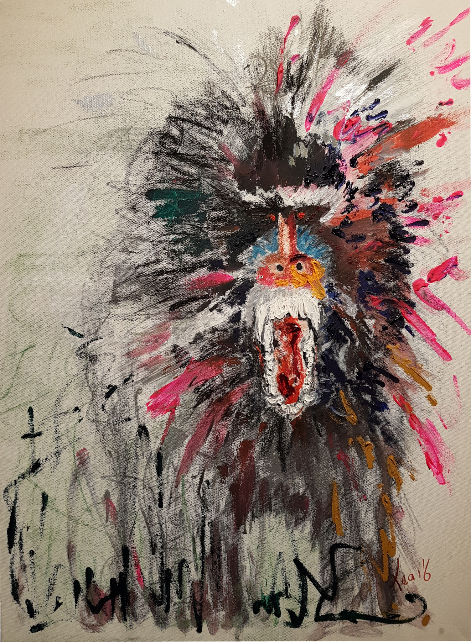Deze Baviaan heb ik geschilderd toen mijn zoon gemolesteerd was. Ik wilde zelf als een brullende Baviaan de dader aanvallen. Op een gegeven moment nadat het Recht haar uitspraak had gedaan werd ik plots bang van het schilderij. Hij verdween in de kast. Jaren later toen ik belaagd werd door een nare ziekte, kwam hij ineens weer uit de kast.. Nu was hij daar om mijzelf te beschermen. Hij bleef brullen tot de ziekte zich terugtrok.