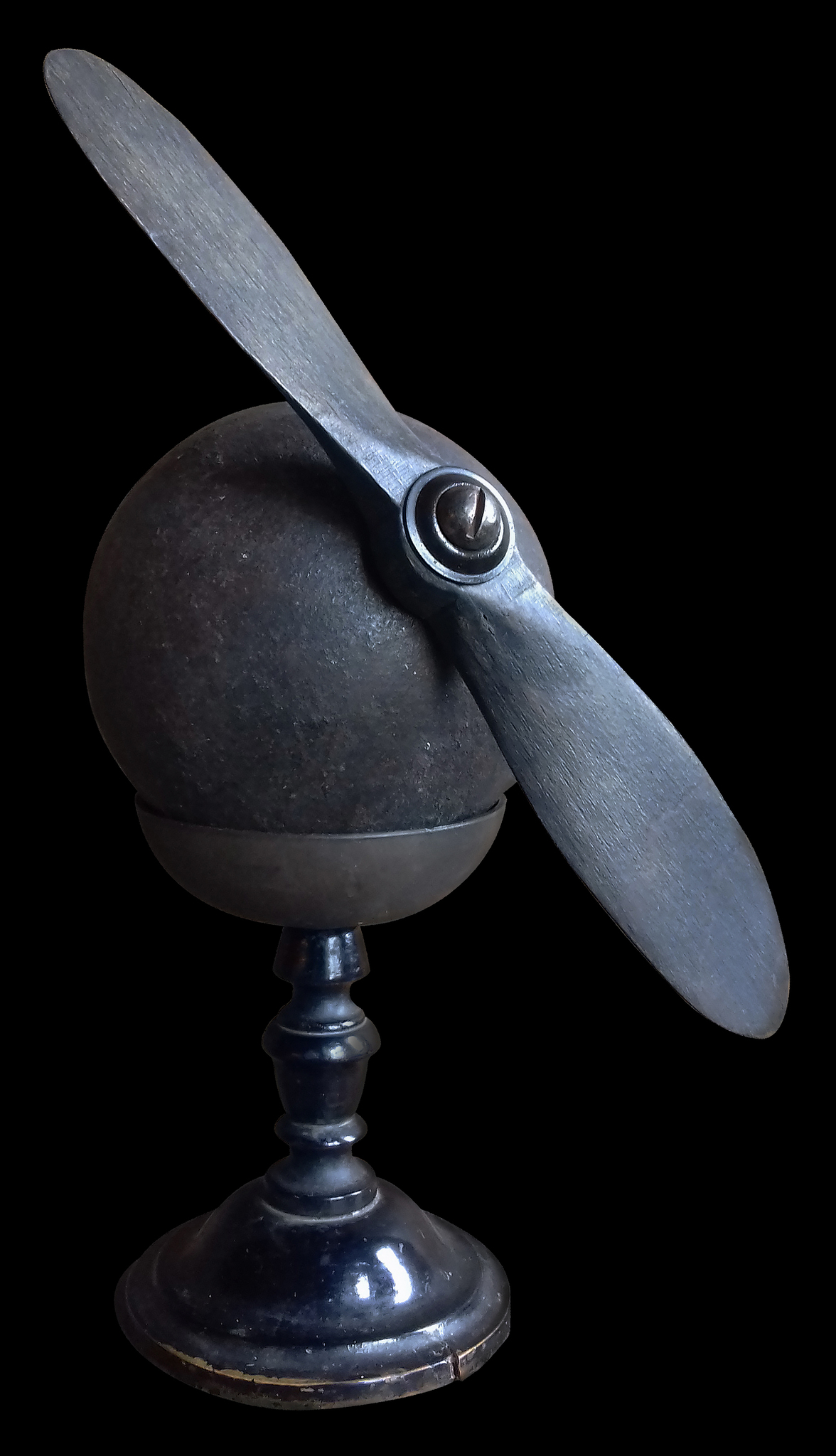 Kanonskogel met houten propellor op antieke standaard.