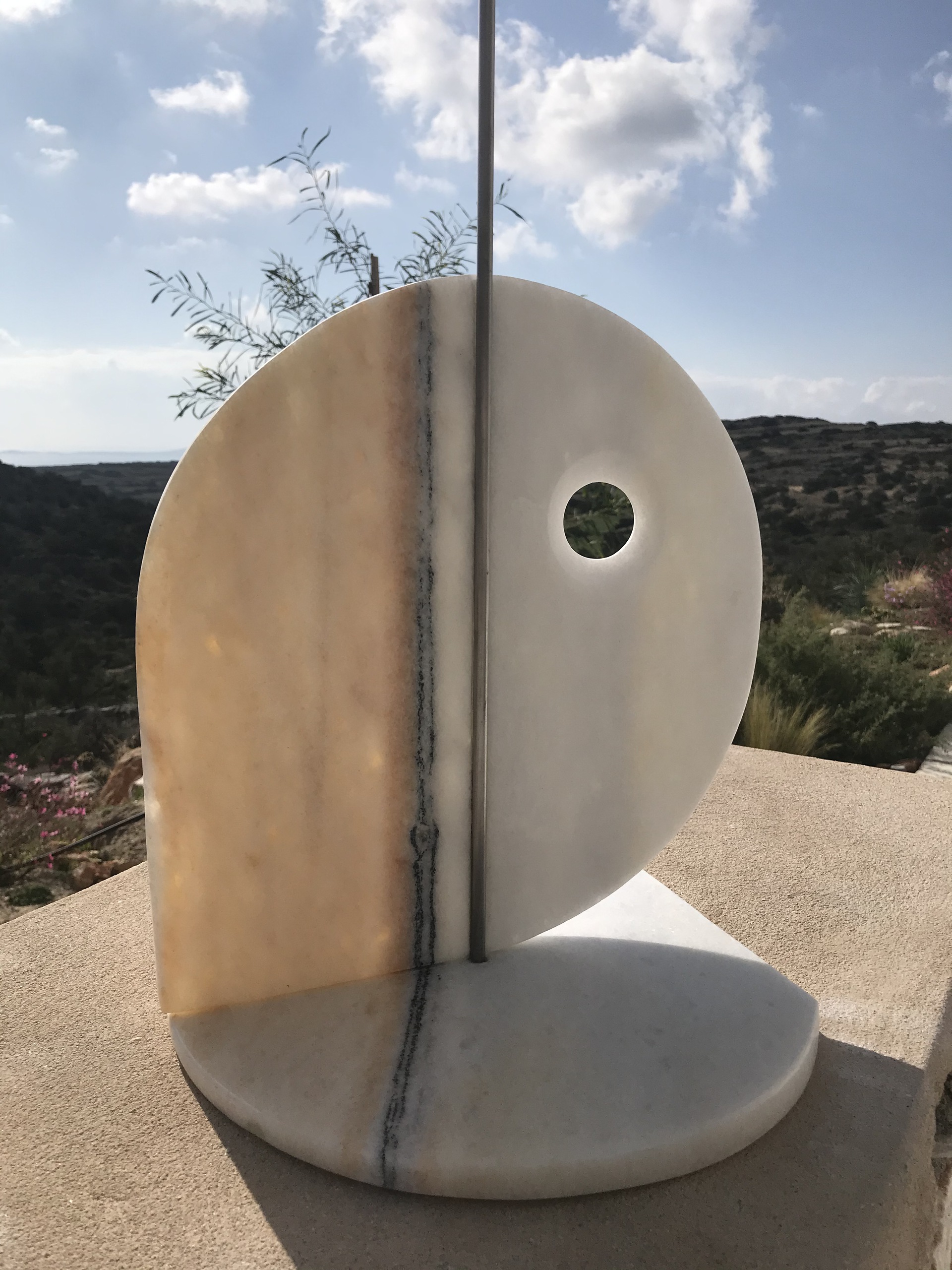 Geometrische vormen in marmer van Naxos met RVS