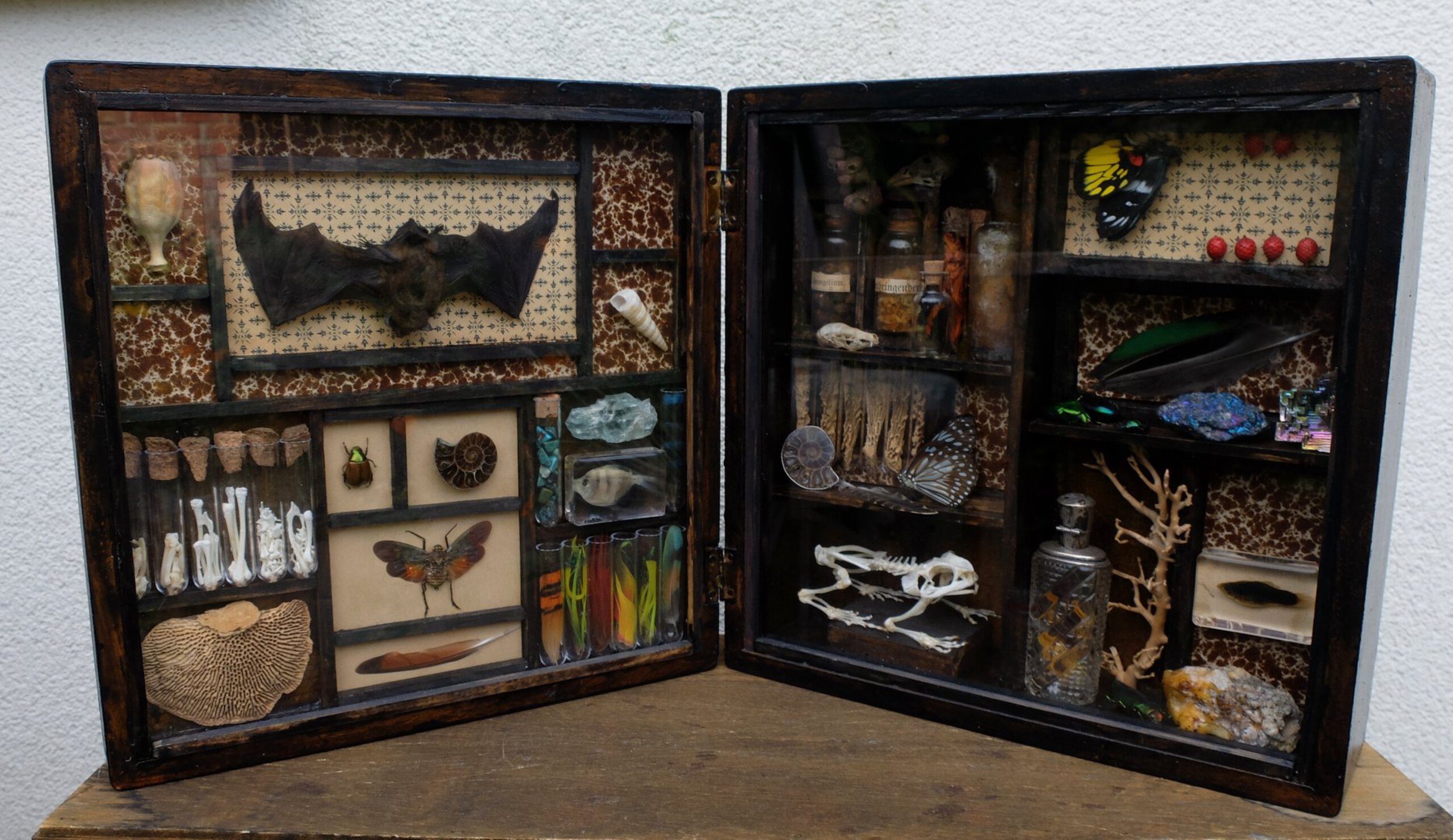 Rariteiten kabinet in Victoriaanse stijl met vleermuis, insecten en het skelet van een kikker