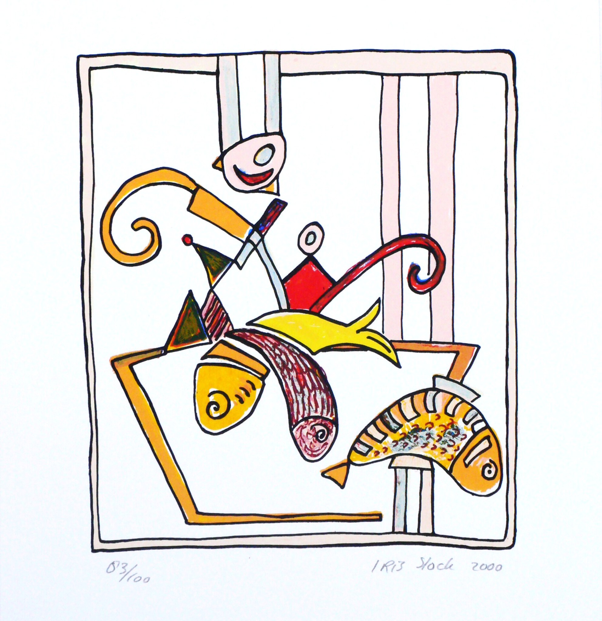 Uit serie vis. 8 zeefdukken met het thema vis op 400 grams zuurvrij papier. Tien tot twaalfkleurig, formaat 20x28 cm oplage 100