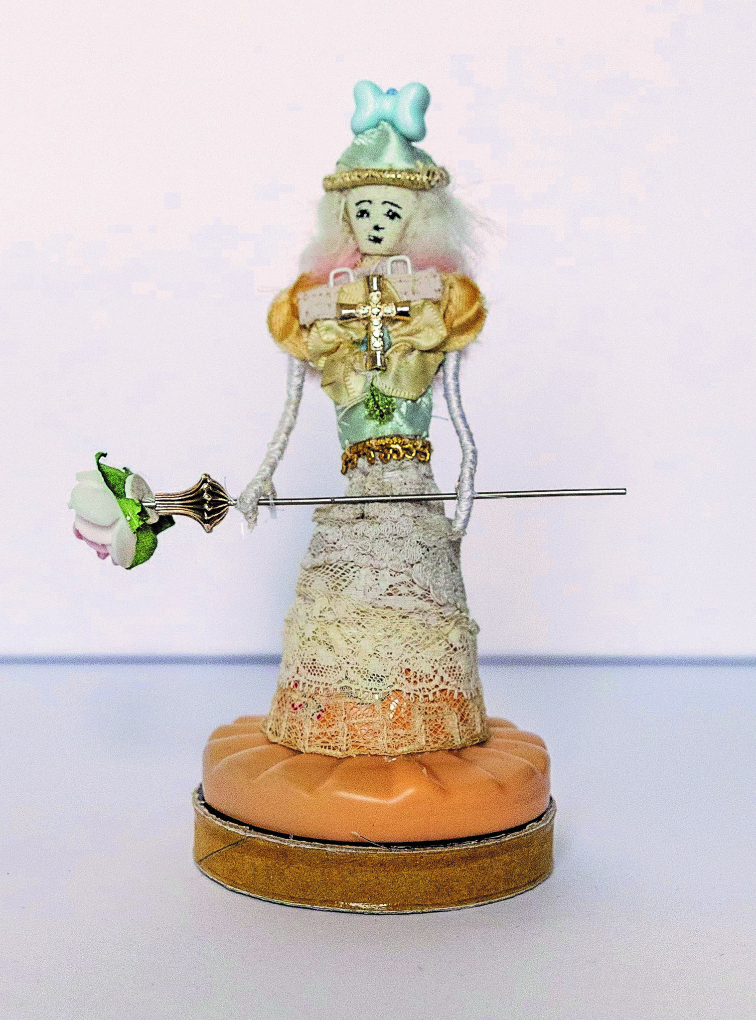 Poppetjesbeeldje met strik in het haar en bloem in de hand.
