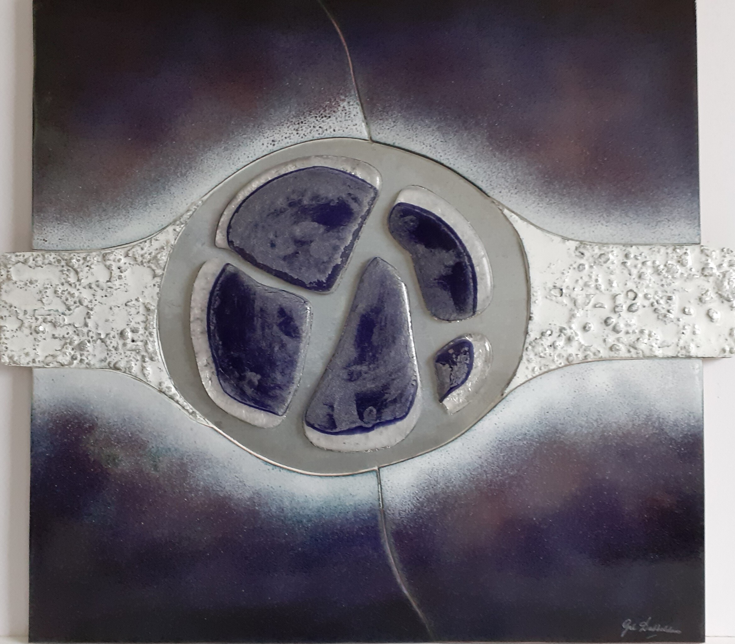 Ik ben emailleur en maak wandpanelen en reliëfs. Vaak verwerk ik er ook gefused- of brokken glas in. De zijkanten en holtes van de reliëfs werk ik af met verouderd zink.