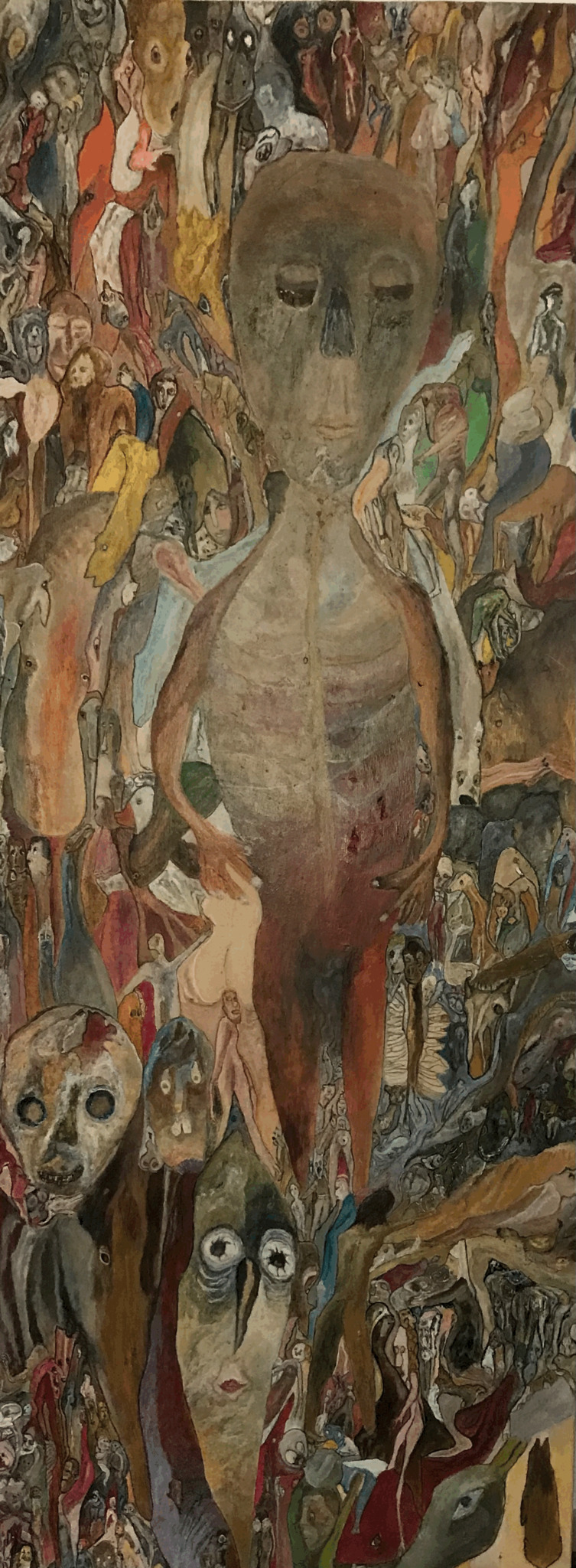 Figuraties die ontstonden door op gevoel met een zeer dunne penseel te werken. Als ik alle uren, dagen, maanden op zou tellen misschien wel drie maanden continu, vanaf 2019 tot nu. Het is nog niet af. Waarschijnlijk zal het nooit af zijn.