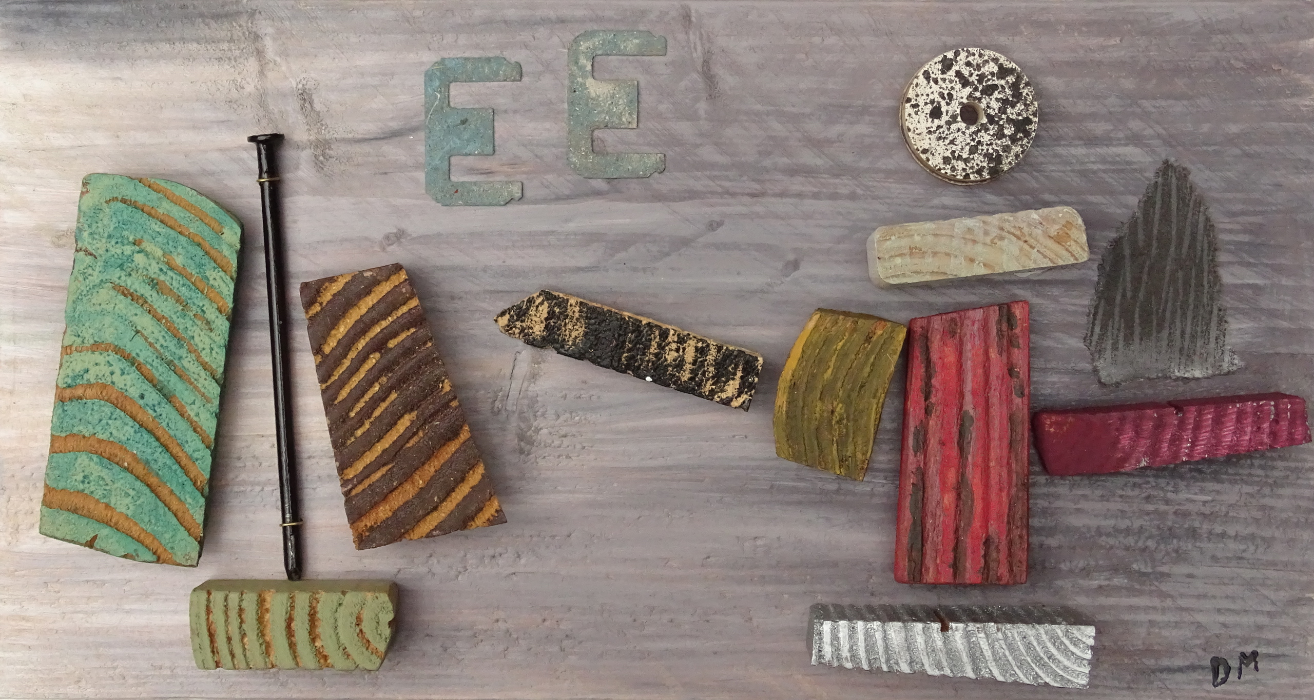 De ene kant of een ander / de richting is onzeker, of / wat beweging zal brengen. //Zeker, ruimte staat // op het spel. Assemblage / collage (hout, metaal, papeer, verf, objet trouvé)