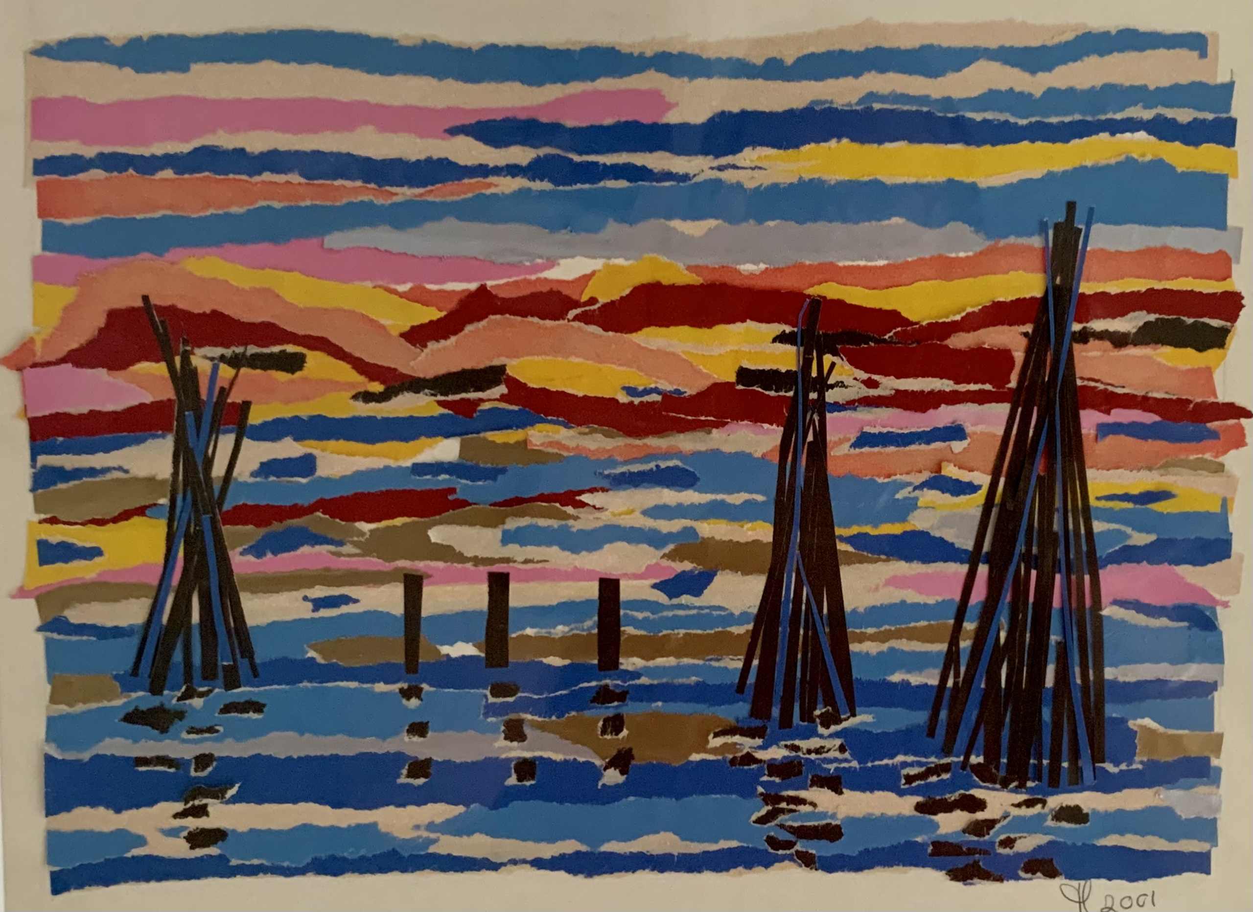 Collage met sitspapier. Een geabstraheerde weergave van het meer van Trasimeno.