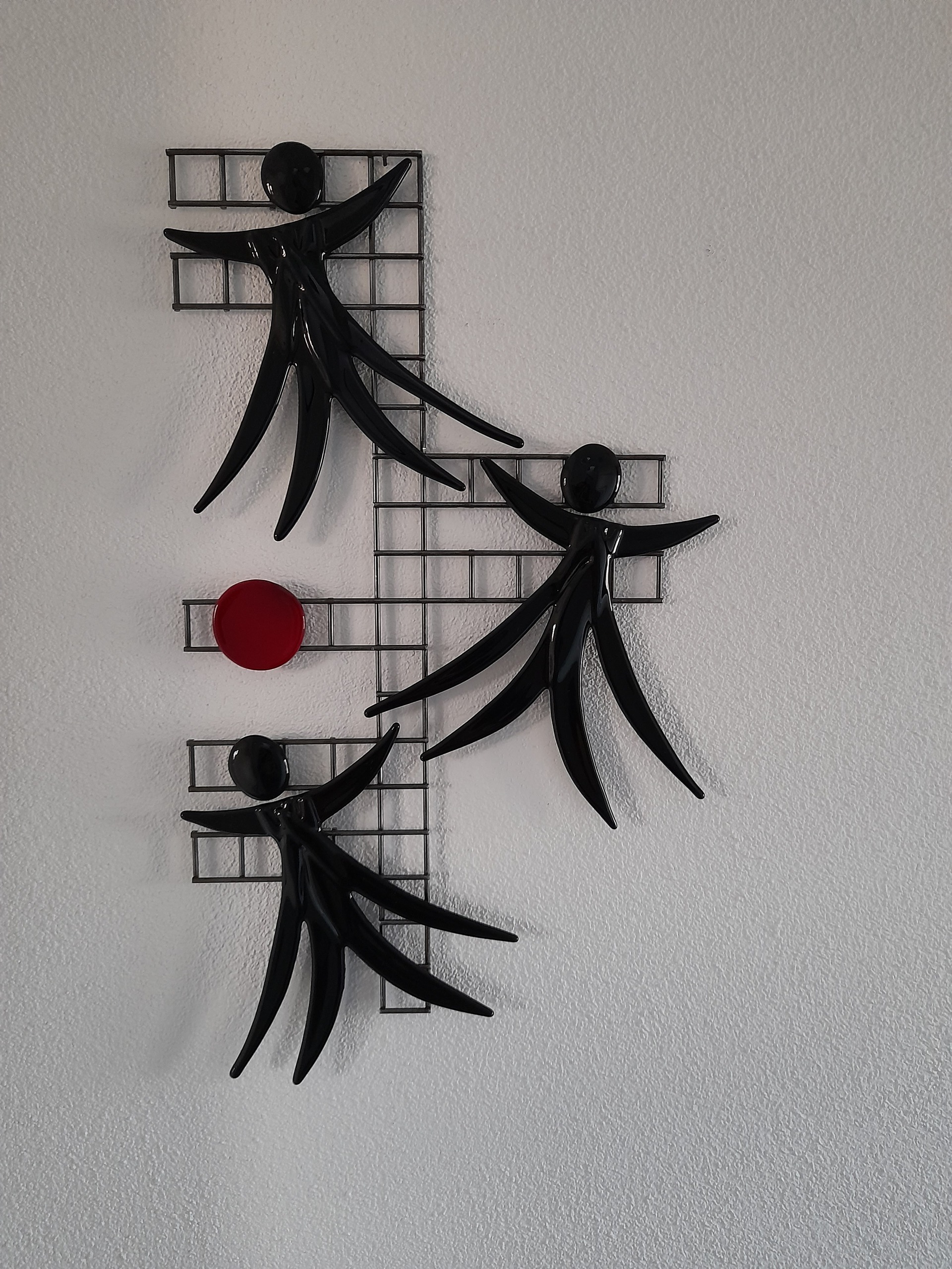 Glas versmolten in de oven en daarna bevestigd op een stuk uitgesneden draadmat welke blank geborsteld is.