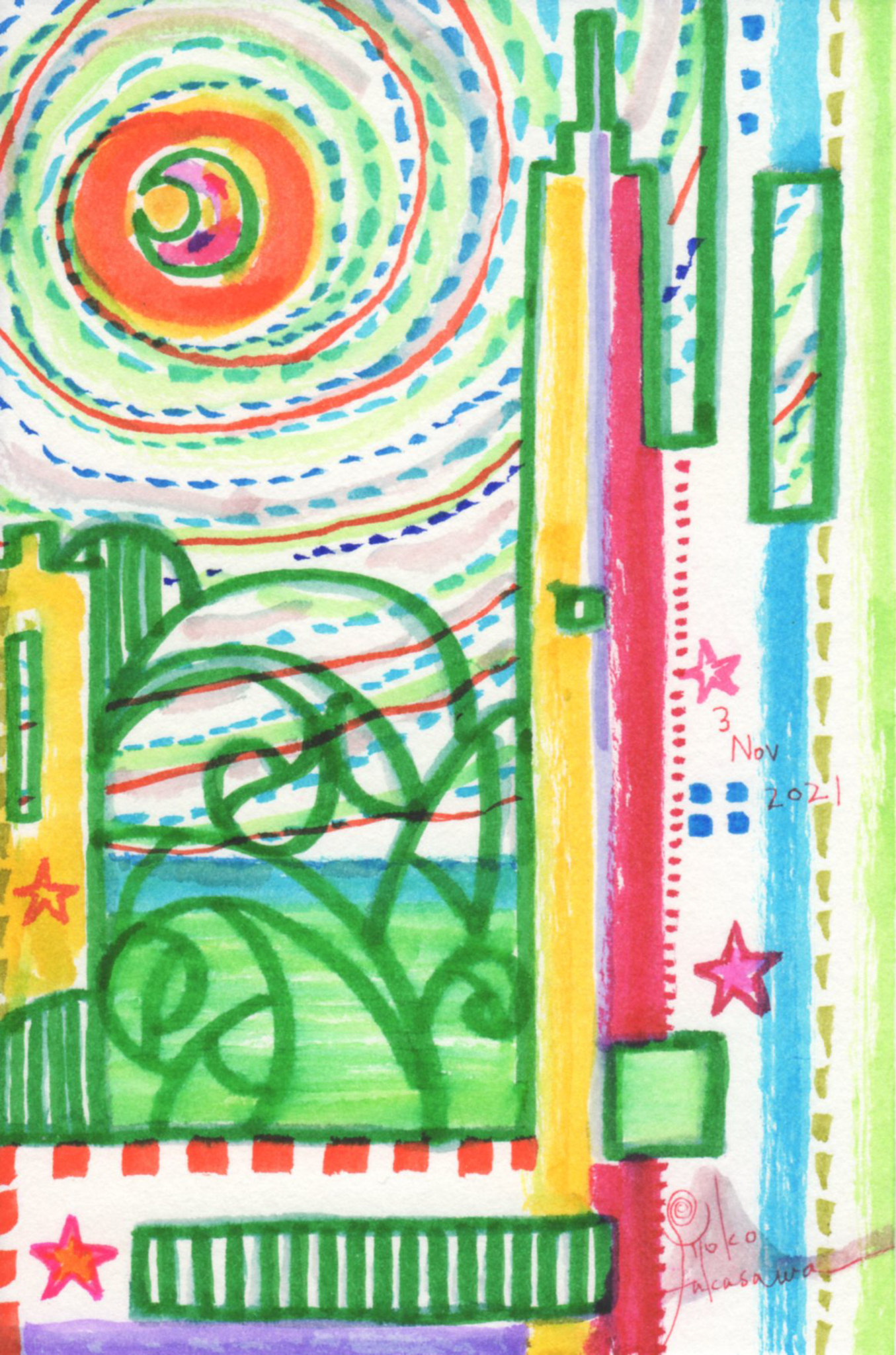 Yoko Fukasawa was born in 1982. 2001-Japan traditional craft department,Metal crafts major 2001-Volkswagen new Beetle - art contest The third place. 2002-TOKYO DOME - Tableware festival Fine work. 2017-And Schizophrenia has been revealed. Her paintings are outsider art. They are characterized by simple shapes and bright colors. She wants you to look at them and relax.