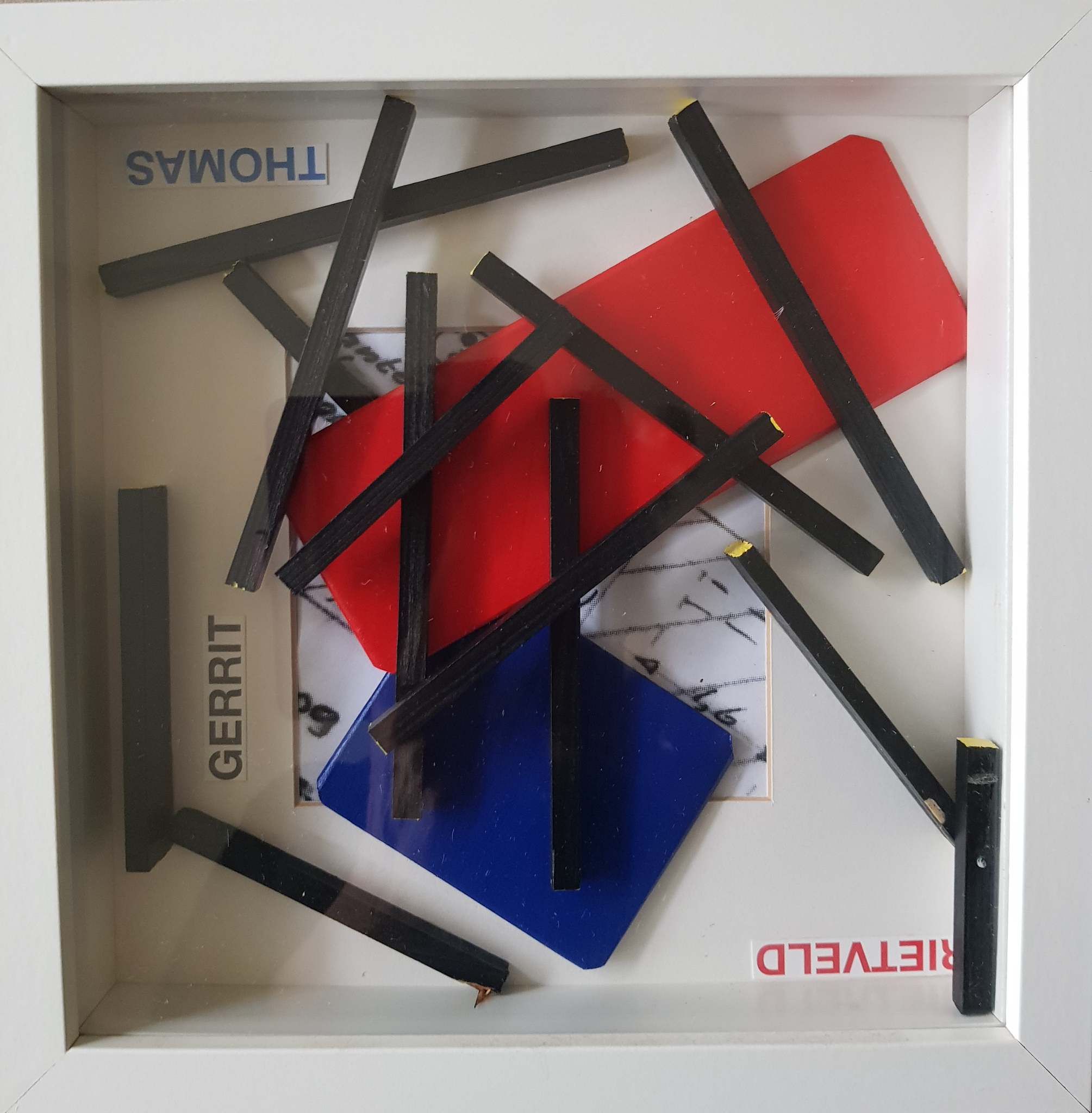Een bouwdoos van de stoel van Rietveld. Ik heb er wat anders van gemaakt in een kleine vitrine