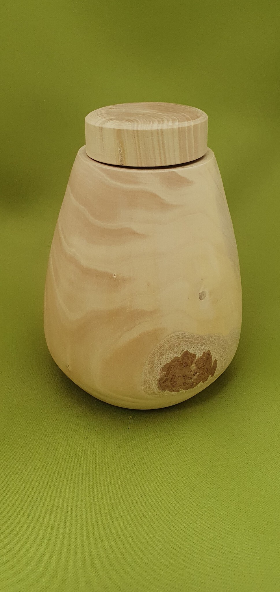 Deze pot met deksel, komt van een ginkgo bilobaboom, die in Dronten gestaan heeft. Een pot van Ginkgo Bilobahout. Bijzonder, want deze houtsoort komt niet zo veel voor in Nederland, althans niet in (gebruiks)voorwerpen. De Ginkgo Biloba is een Japanse notenboom, die vaak bij een tempel geplaatst werd, omdat het hout niet snel vlam vat. Het is licht hout en is een heerlijke houtsoort om te draaien. Hard, maar niet te. Weinig kans op scheuren en afbrokkelen en de kleuren die te voorschijn komen, zijn subtiel.