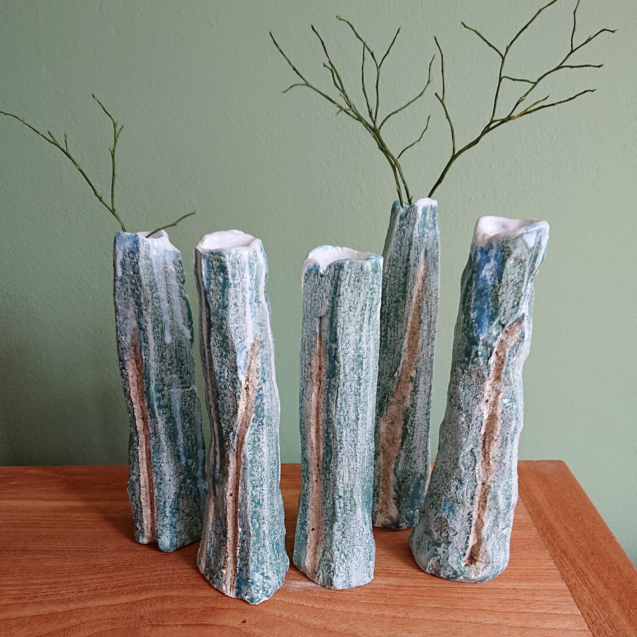 Kurinuki vazen, unica, blauw en wit glazuur als kleur accent zand uit Utah. Prijs per stuk, nog 1 over.