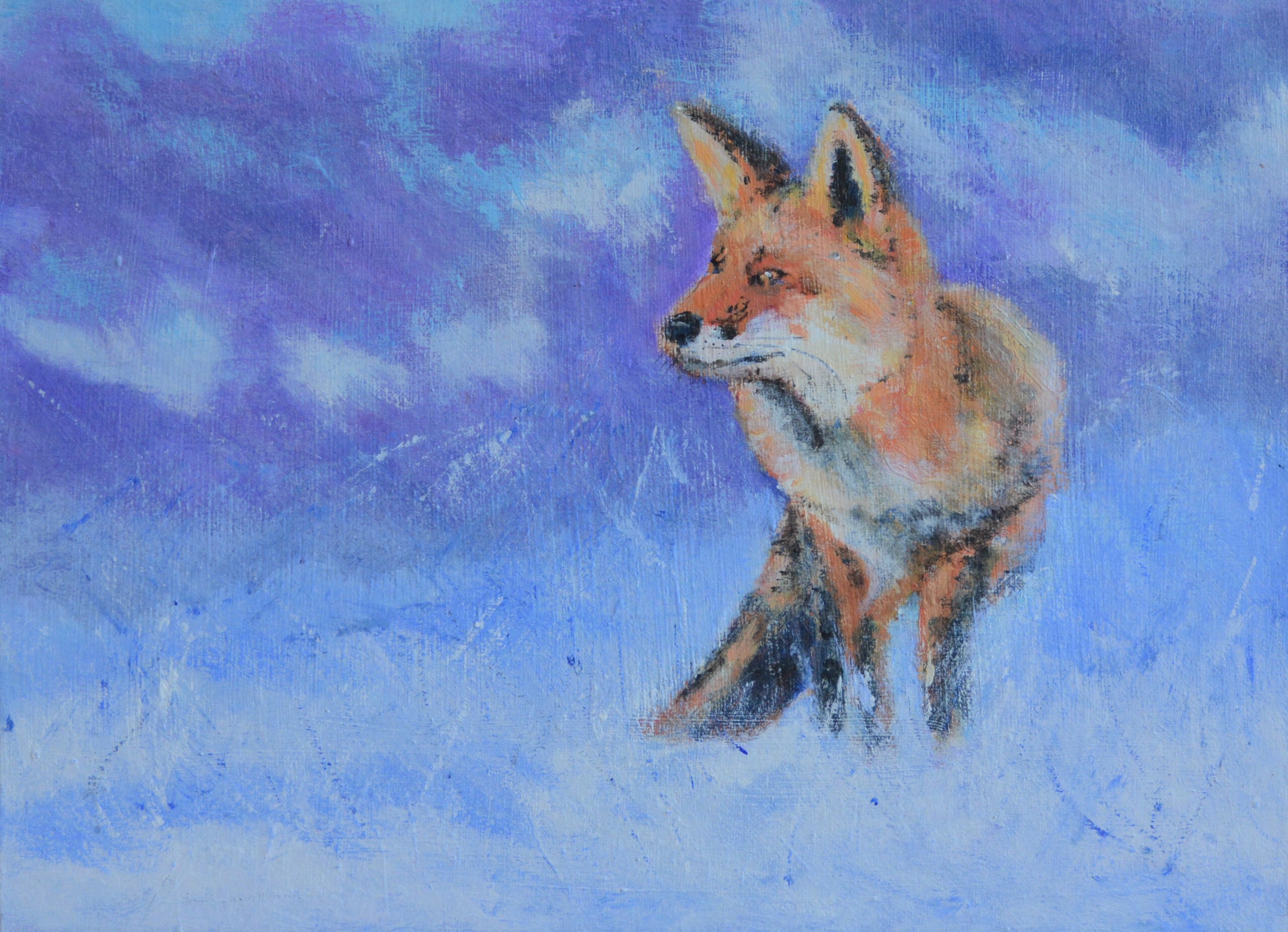 De vos kijkt om zich heen, op zoek naar een prooi in of onder de sneeuw. Geschilderd op canvasboard.