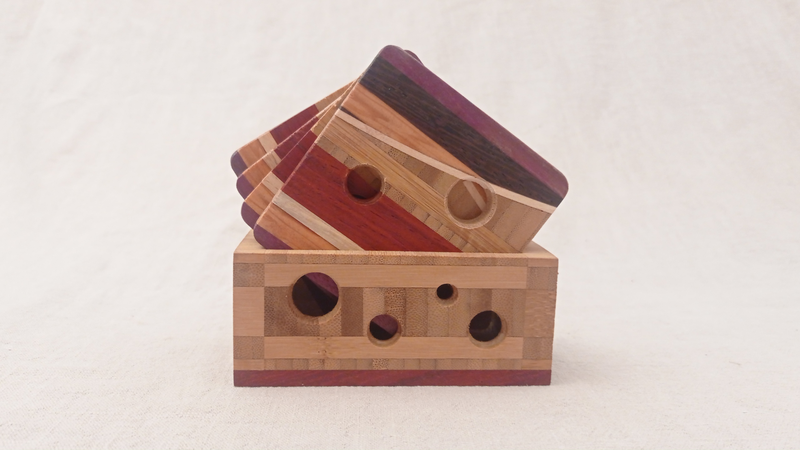 Deze onderzetters zijn gemaakt van samen geweven hout soorten,en bamboe. De soorten hout zijn : padoek ,purple heart , wenge,esdoorn,and bamboe . De houder is gemaakt van bamboe en padoek