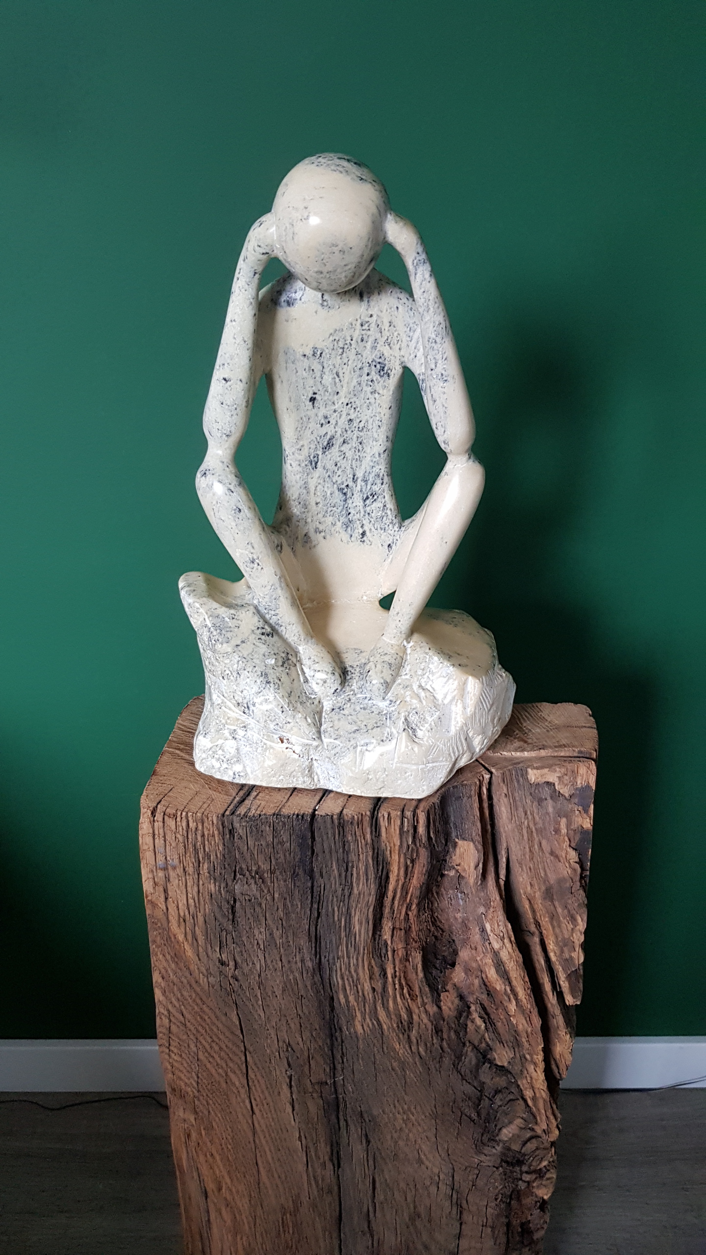 De opdrachtgeefster plaatst het beeld in haar haptonomie praktijk. Het beeld laat een persoon zien die vast zit in zijn eigen gedachten. De ruwe rug toont de ballast die de persoon met zich mee draagt. en tenslotte het zware blok aan de voeten.
