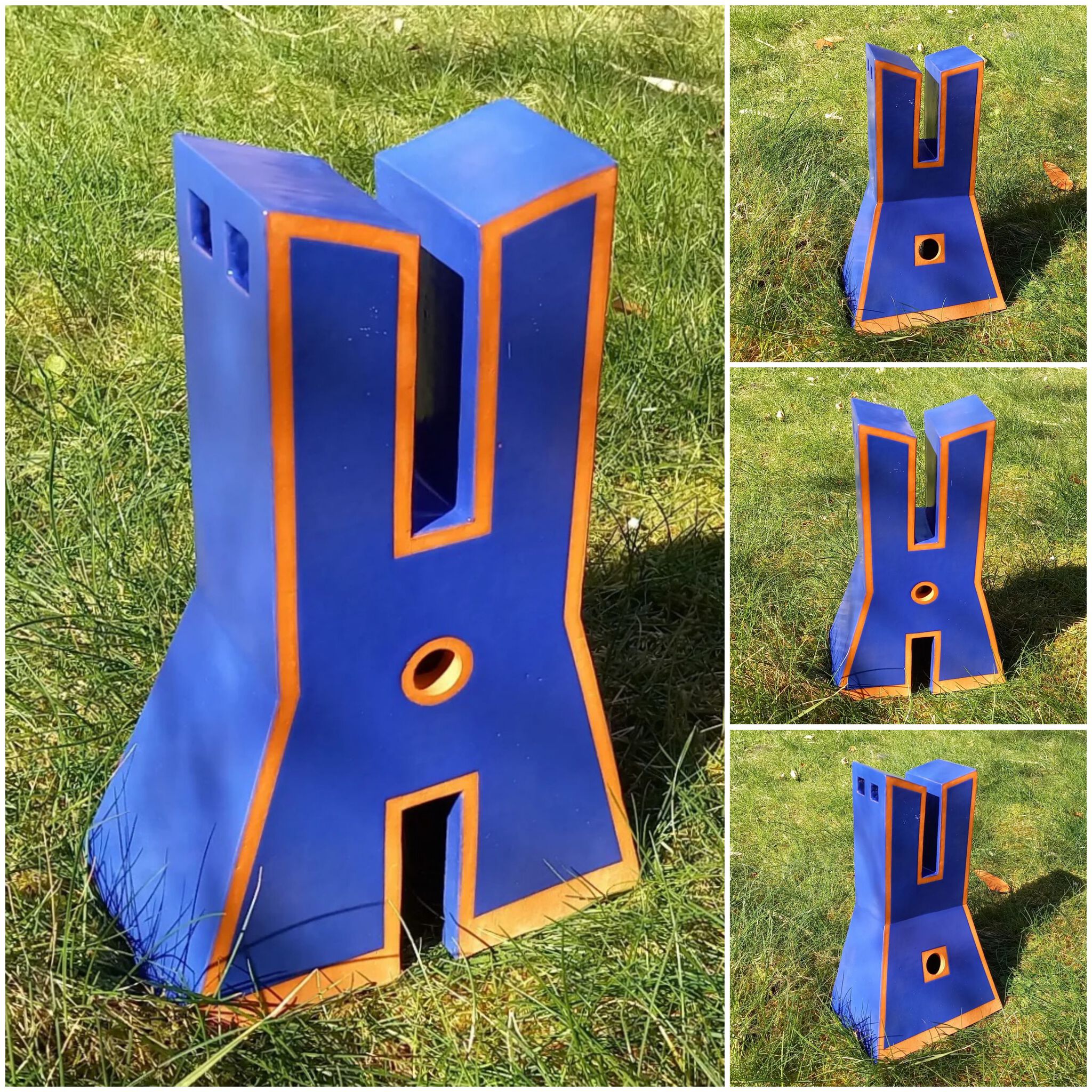 Fantasiekapel met twee torens. Rode klei en blauw glazuur.
