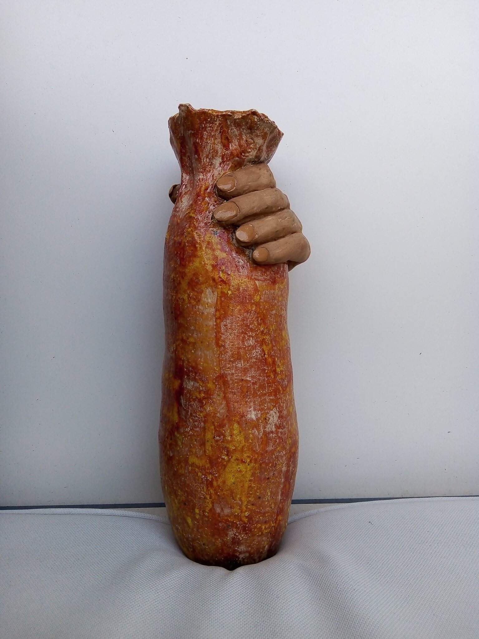 De opdracht was in expressionistische stijl een emotie in vaas vorm te maken. Voor mij kwam het beeld van een hand die aanvalt/verstikt door lockdown/black lives matter /klimaat