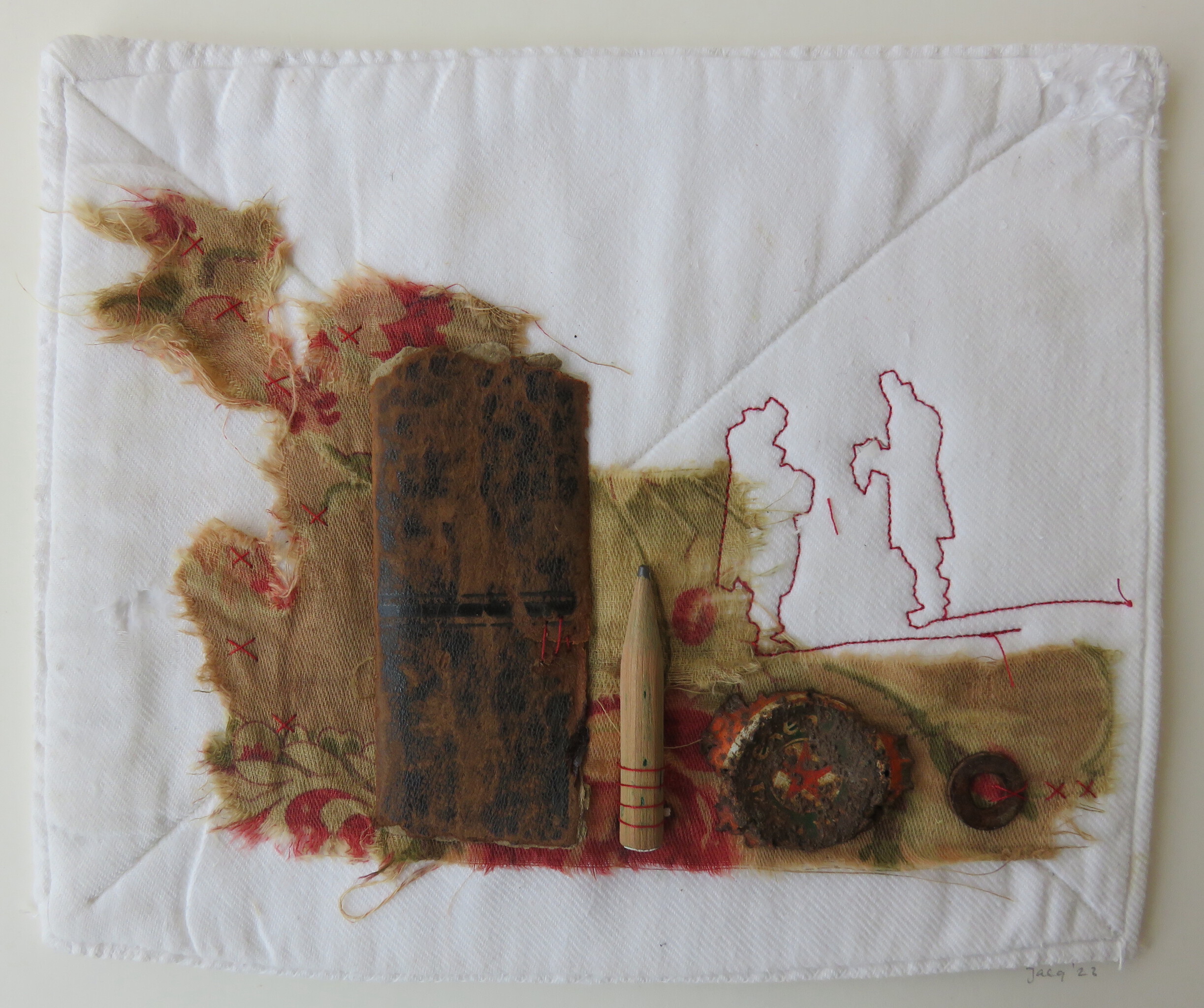 Uit de serie Past present, collage van oude textiel, boekrug, versleten potloodje mixed media, ingelijst.