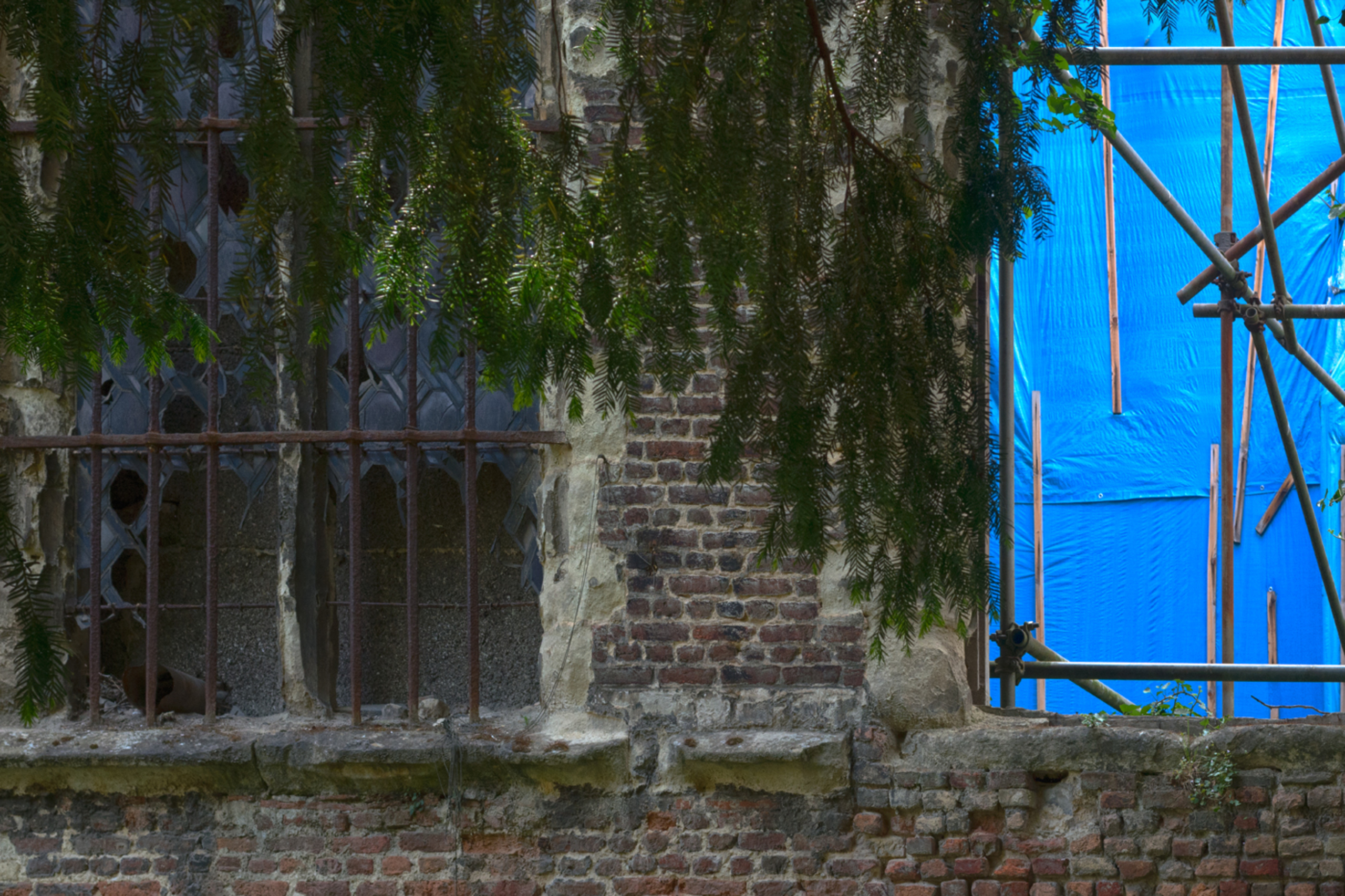Kerk Bouwerkzaamheden Antwerpen Compositie Blauw Groen Oud Steigers Fotografie Stadsfotografie