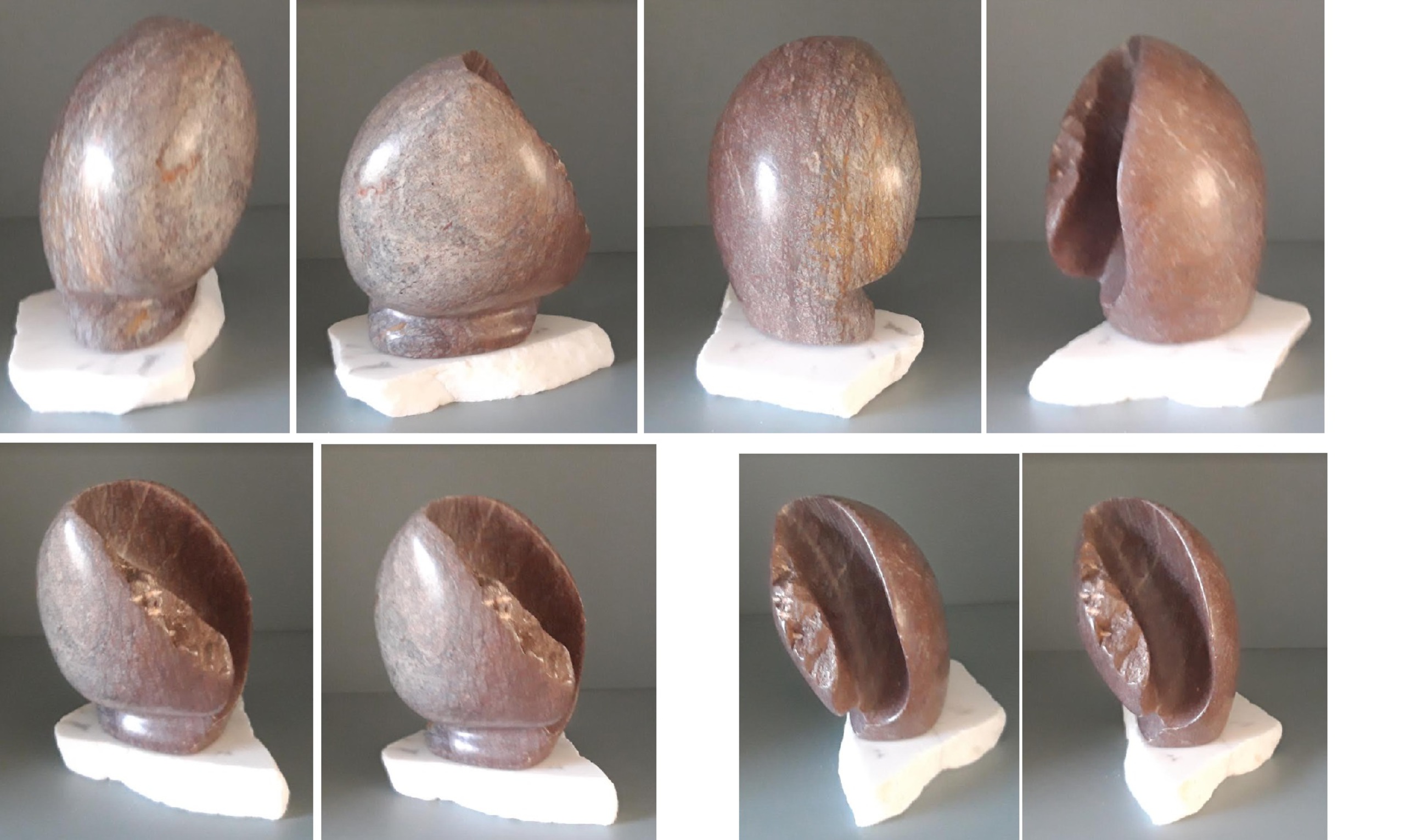 (klik op de afbeelding voor de prijs en om het werk groter te bekijken) Met veel plezier heb ik voor een eerste keer met deze steensoort Rapoko gewerkt. Tijdens het werk kwamen er zulke levendige kleuren tevoorschijn die ik van tevoren niet had kunnen bedenken. Het beeldje kan buiten staan! Het is een soort half afgeknabbeld 'chocolade ei' geworden, je zou er zo je tanden in zetten...