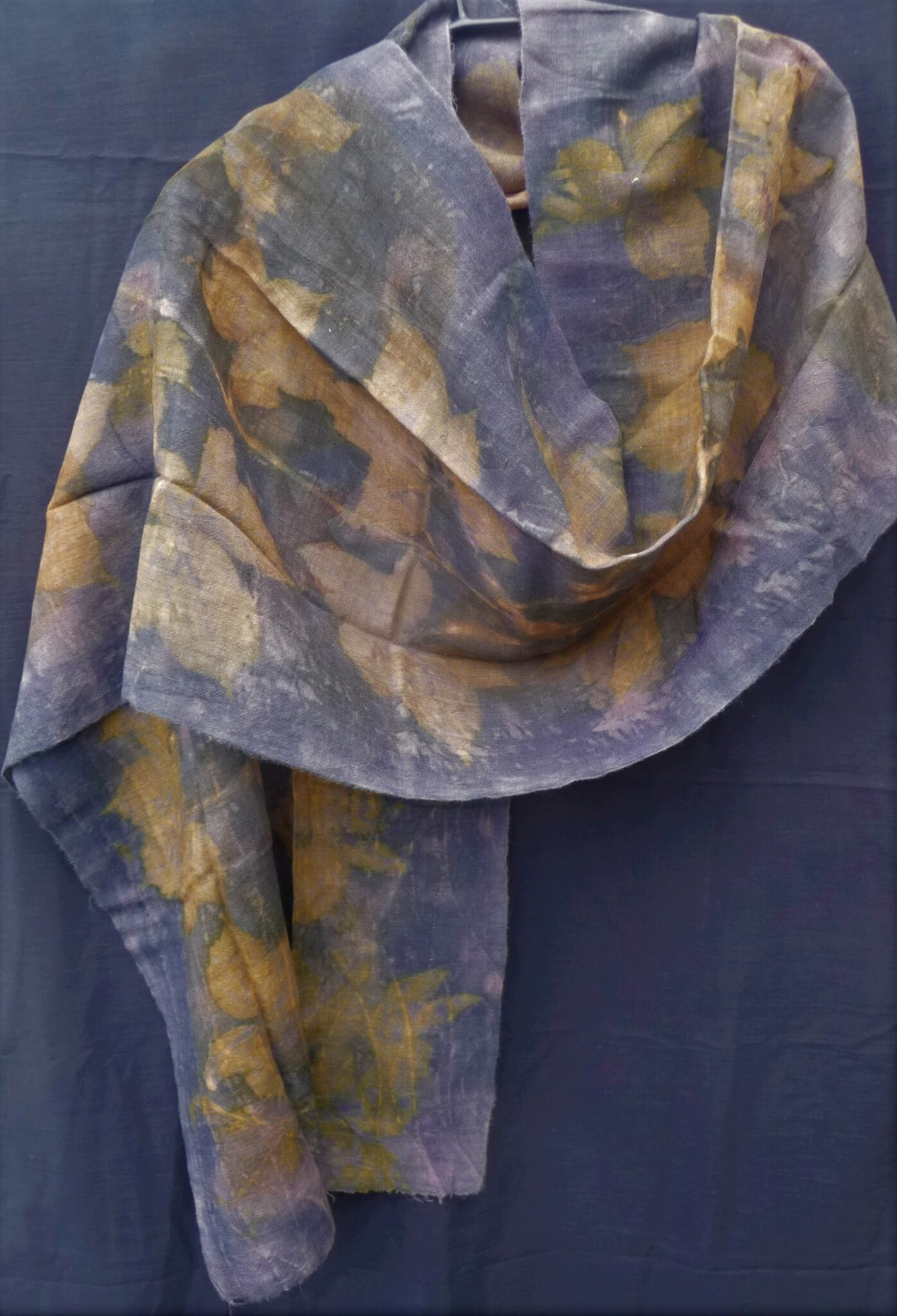 Mooie grote sjaal van wol etmaine. Geverfd in blauwhout en geprint met oa. wilde wingerd