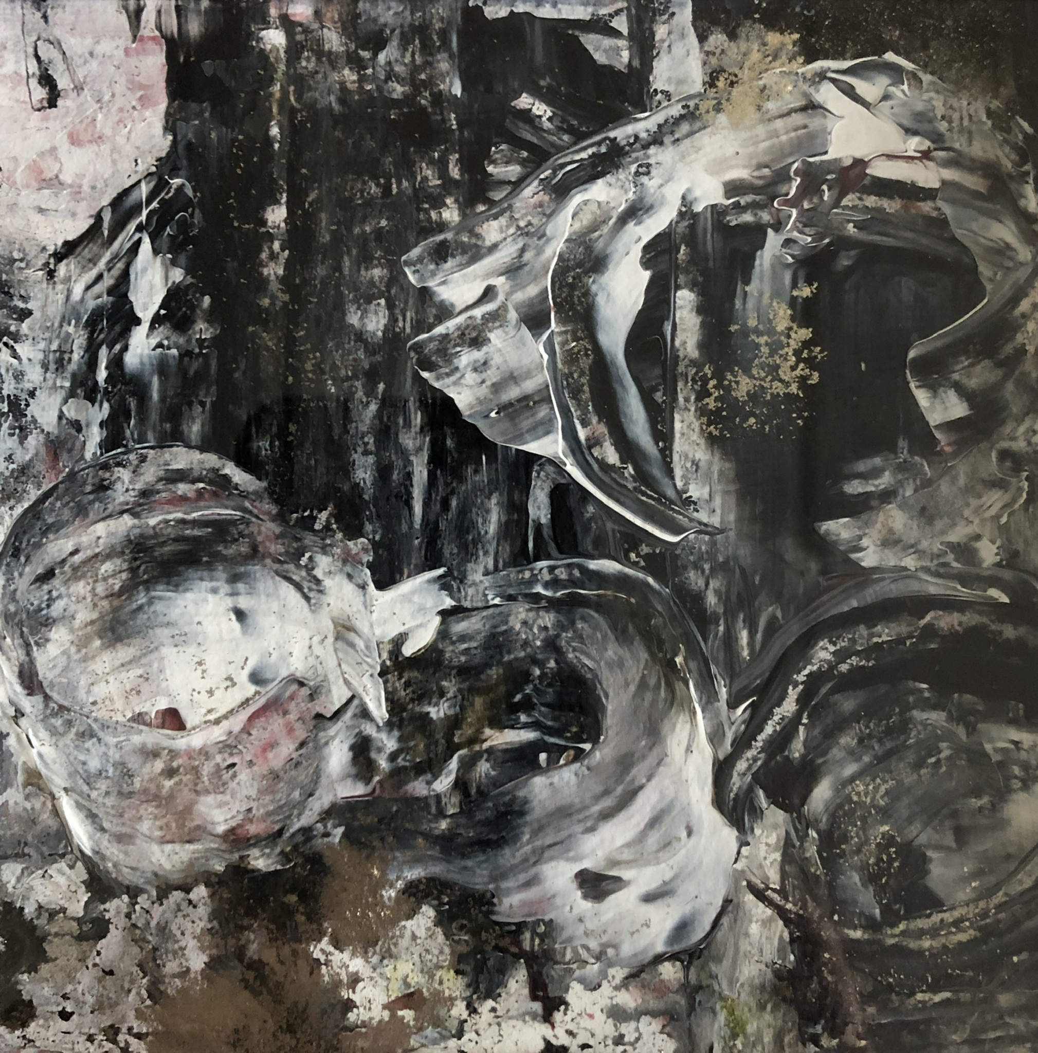 Kunstwerkje in soort van houten kistje achter glas 25x25