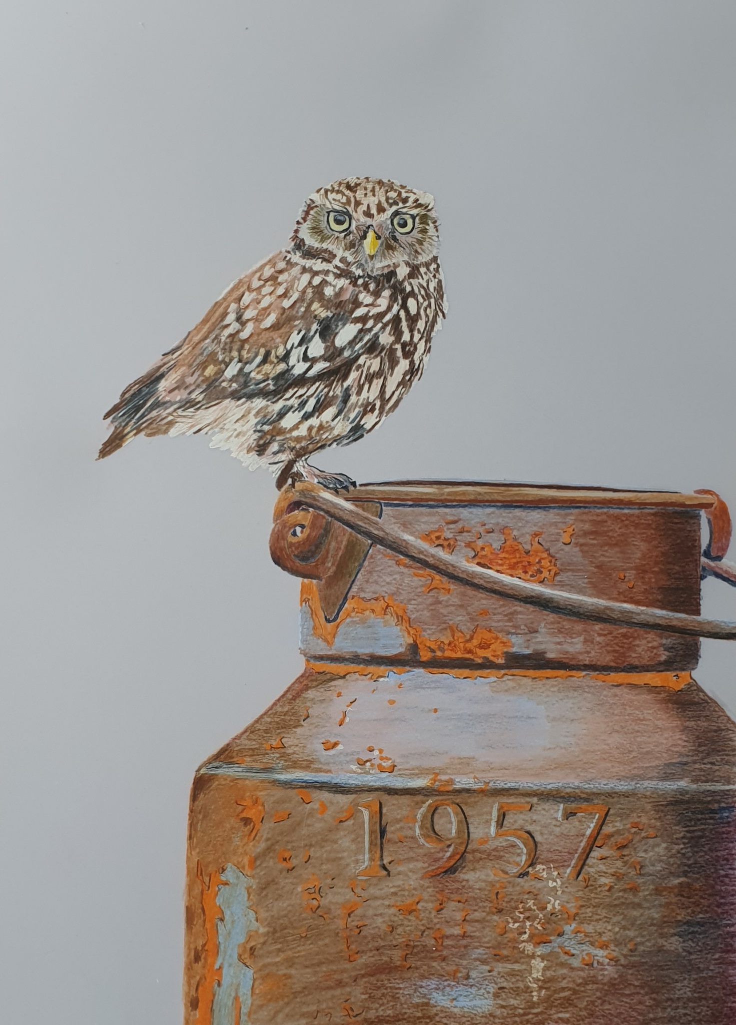 Steenuil op oude melkbus