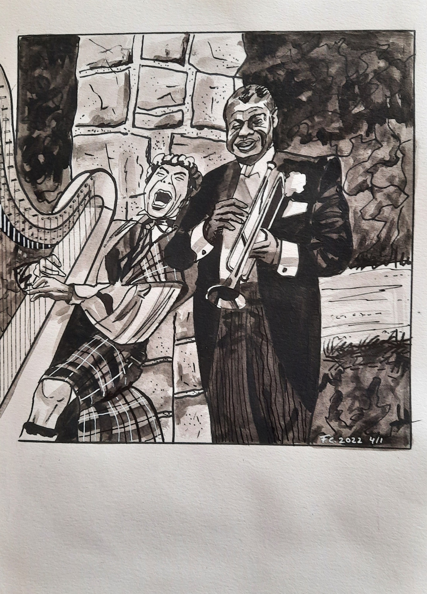 Portret Model Zwart/wit Harp Trompet Vintage Harpomarx Louisarmstrong Humor Komisch