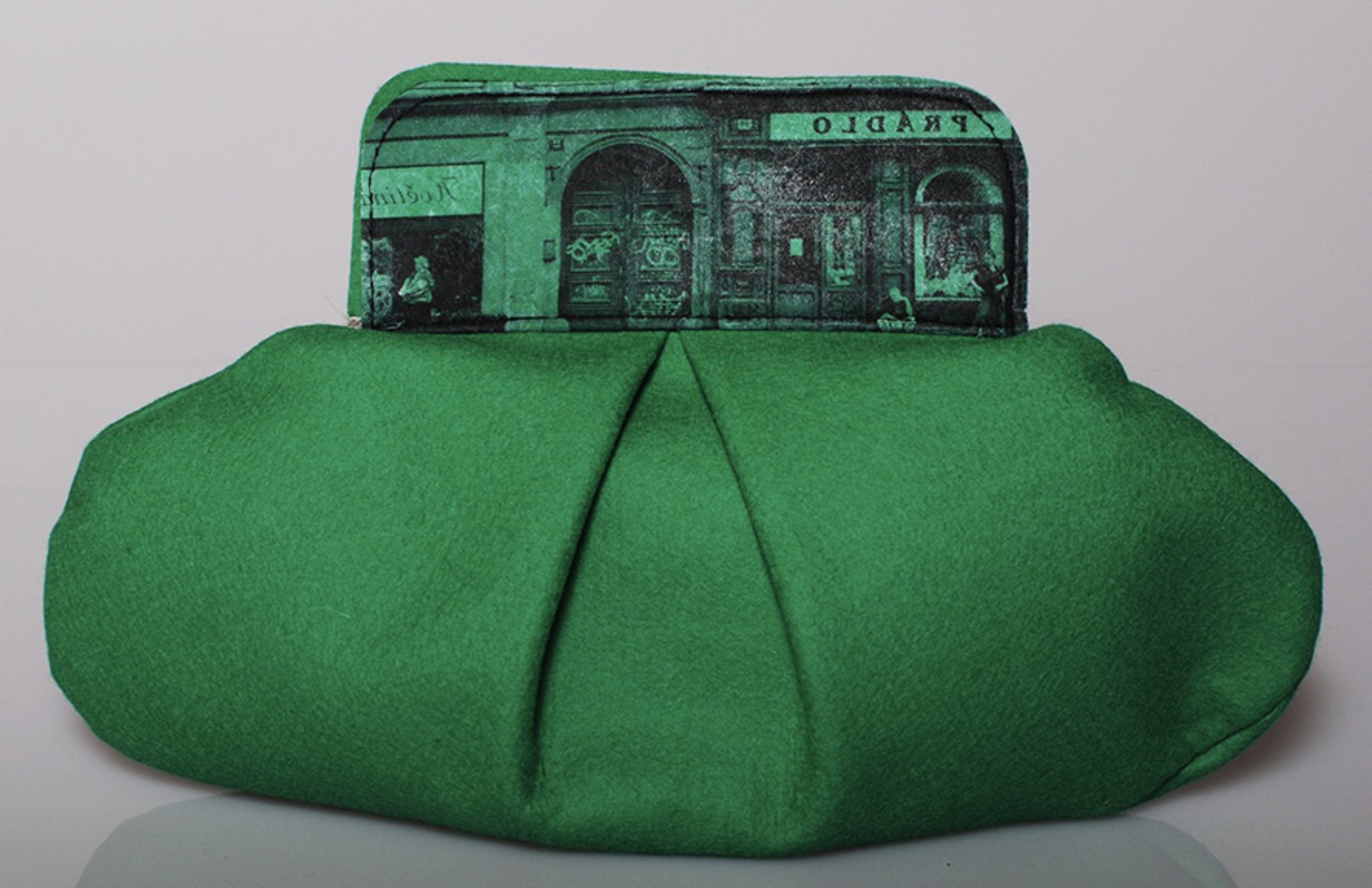 Tas"Praag" is gemaakt van industrieël vilt. Met transferdruk is er een foto afgedrukt van een gevel uit de stad Praag. Het is een Glutch, dwz een handtas zonder hengsel of schouder band.