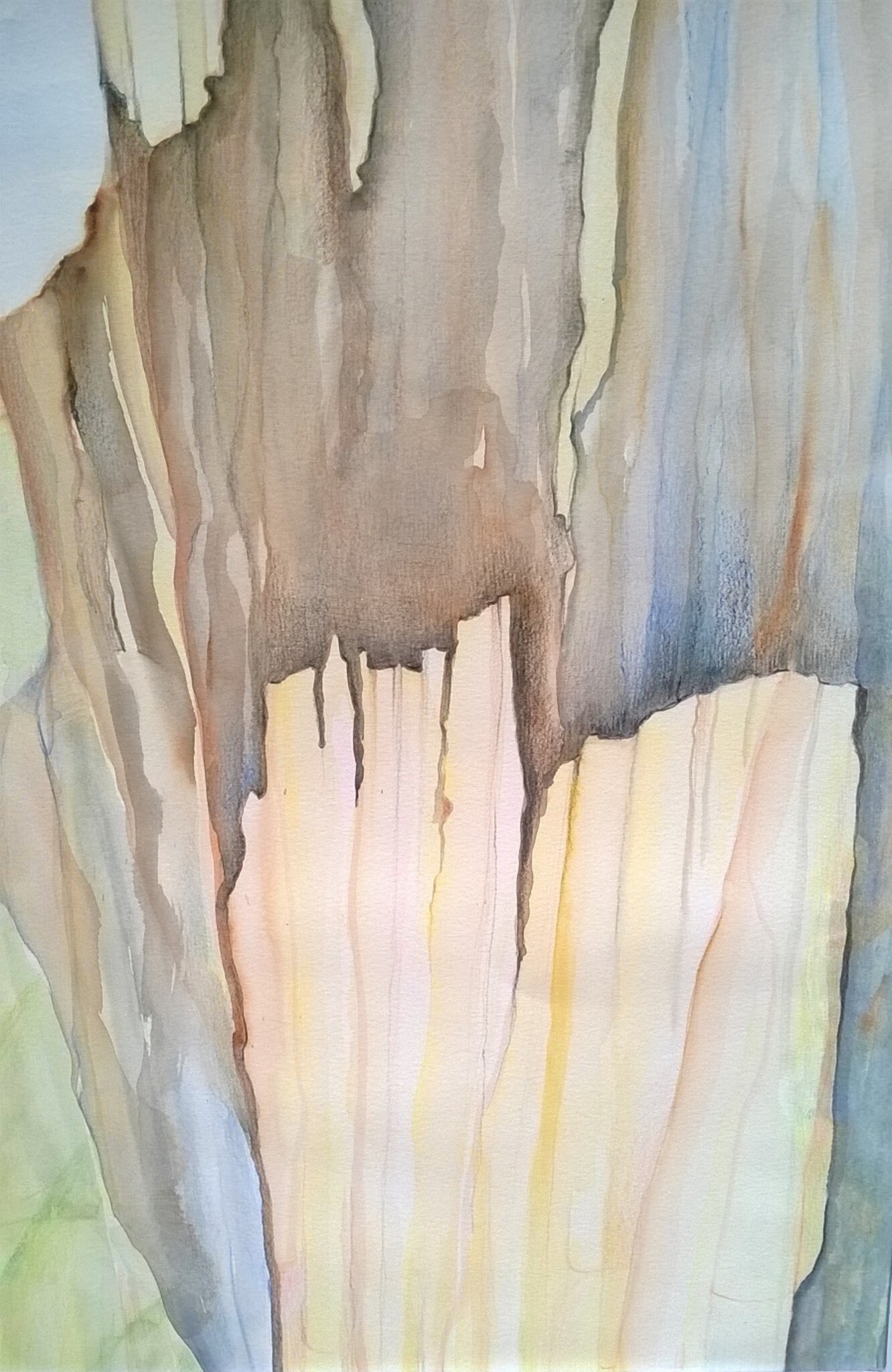 Aquarel in combinatie met krijt. Gemaakt n.a.v. realistisch schilderij van boomschors, dat loslaat van de stam ( natuur ; boomschors)