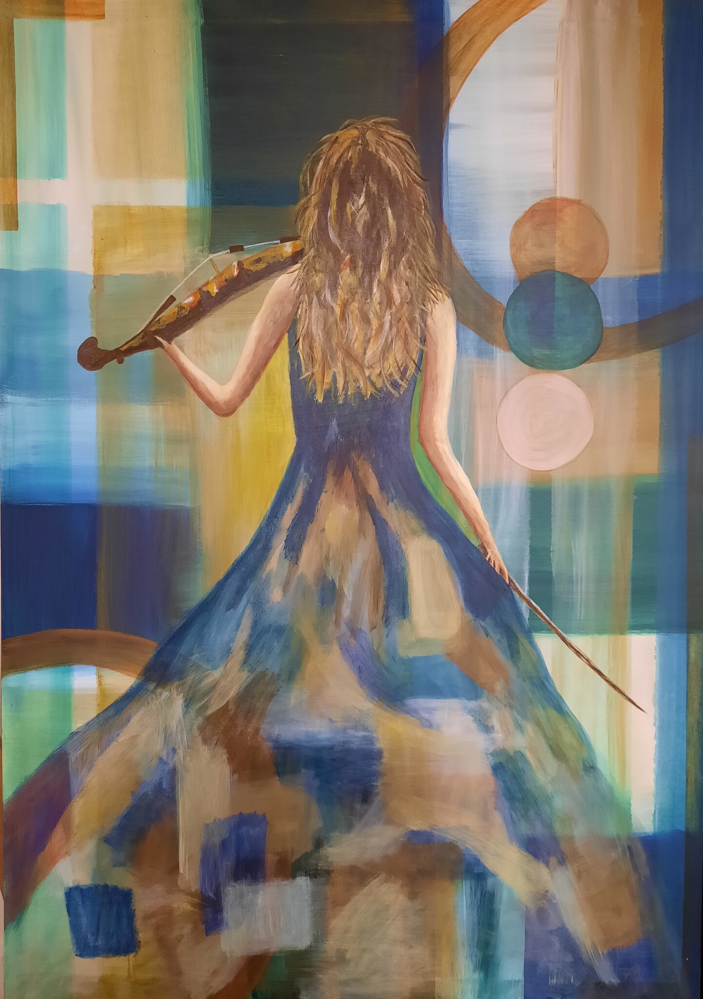 meisje met viool is een mooi schilderij met de kleuren van de achtergrond in haar jurk verwerkt, het is geschilderd in een abstracte vorm